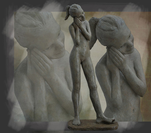 Berit Hildre talla la tierra en lleno, sin palomina, ni refuerzo. “Encuentro así más libertad en la forma, no me gusta la idea que haya un hueco…” El artista trabaja a la vez sobre varias partes, para darse tiempo a la reflexión y la maduración. Algunas son de tamaño modesto, otras mucho mayores. Pacientemente, retira los pedazos de tierra inútiles, hace nacer en el bloque una forma humana, lo precisa poco a poco… Antes de cocinarlo, deberá vaciarlo y hacerle el secado. “La preparación es pues bastante larga. Entre el pequeño proyecto, la realización de la tierra, el évidage y la cocción, se tarda varios meses.” Las piezas resultantes se confían a un fundador para efectuar tiradas en bronce. Para Berit Hildre, estas piezas son como sus pequeñas hijas, una encarnación espiritual que reflejan su propia infancia.