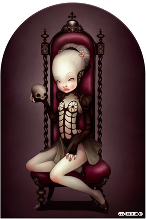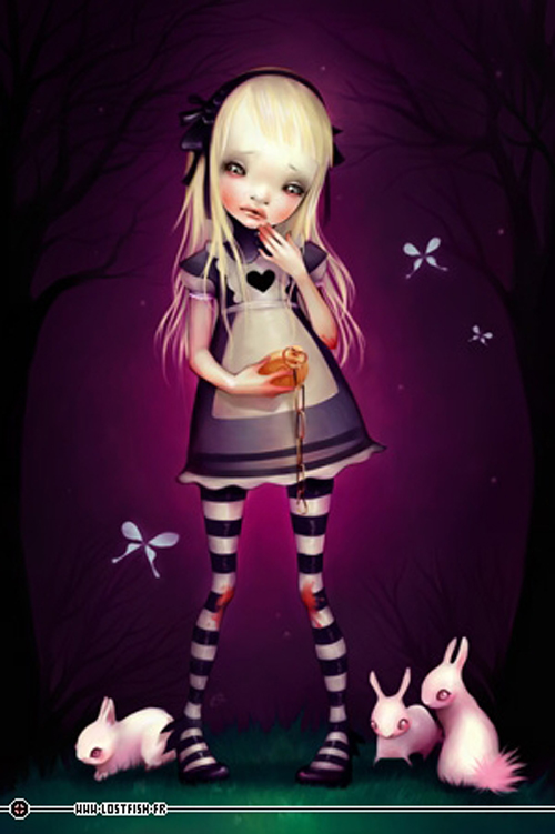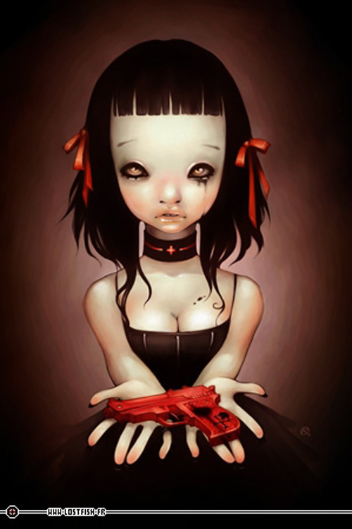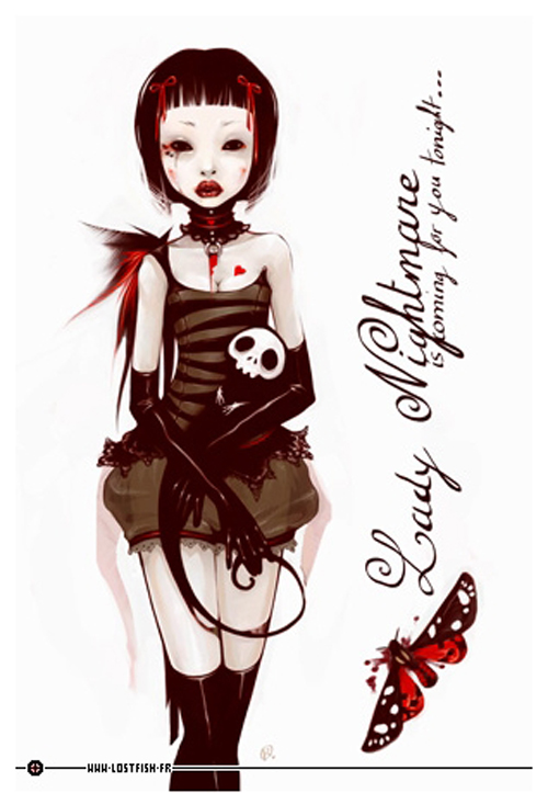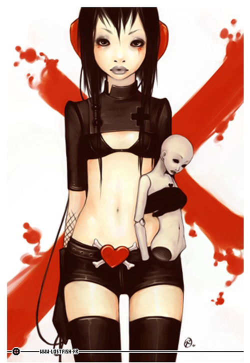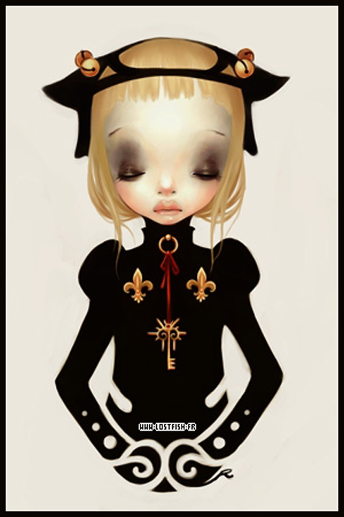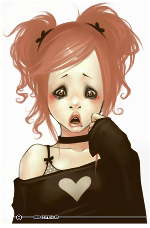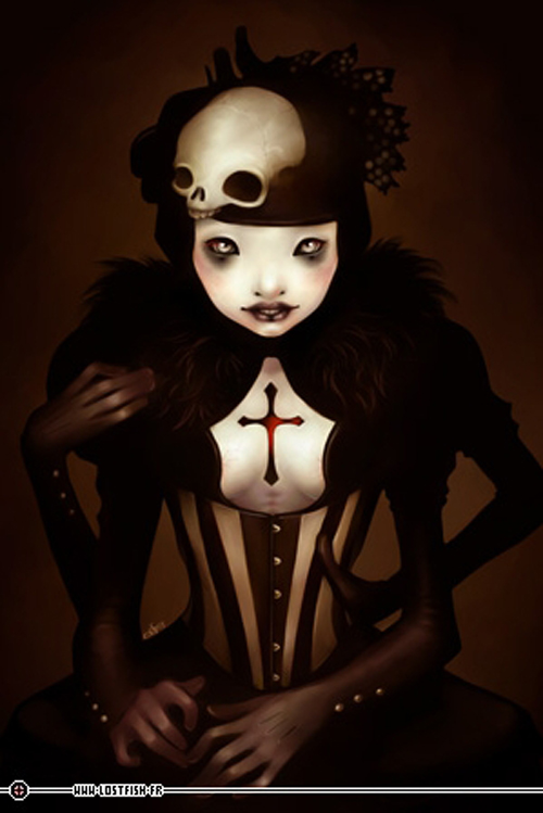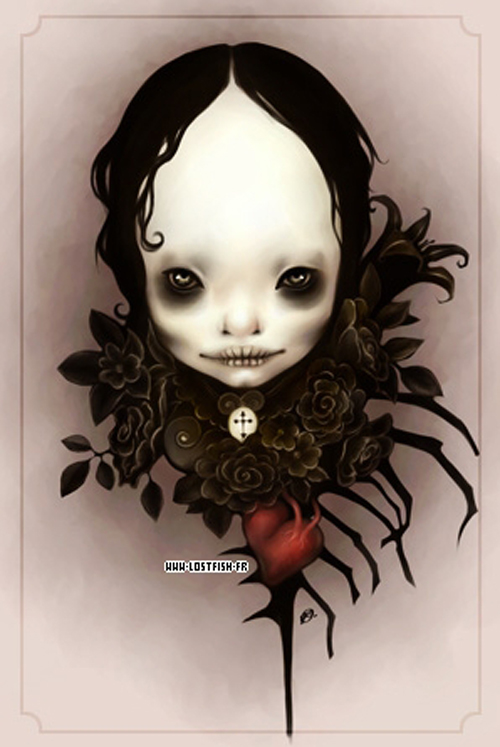 Elodie es el nombre de LostFish, una ilustradora nacida en el sur de Francia en 1983. La artista centra sus ilustraciones usualmente bajo los conceptos de universos decadentes, infancia extraña y torturada, erotismo suave, muñecas, fetichismo… La inspiración para crear estas niñas-mujeres/mujeres-objeto (según su propia descripción), estáticas, casi rígidas, se haya no sólo en los conceptos anteriormente nombrados, sino en una gama mucho más amplia de ideas actualmente agrupadas bajo el termino de «lowbrow»: Un popurrí de muñecas suavemente eróticas, femineidad, infancia atemporal, detalles que enfundan un evidente amor por todo lo que podemos englobar bajo el nombre de neovictoriano (gótico actual, steampunk, adaptaciones del victoriano puro), con un toque de gore, misterio, sombras y -un acercamiento de- la escena G&L.