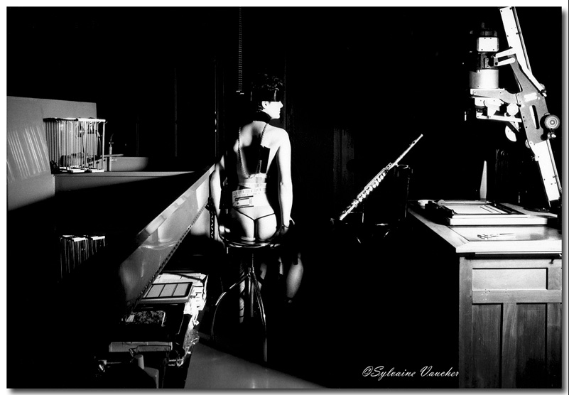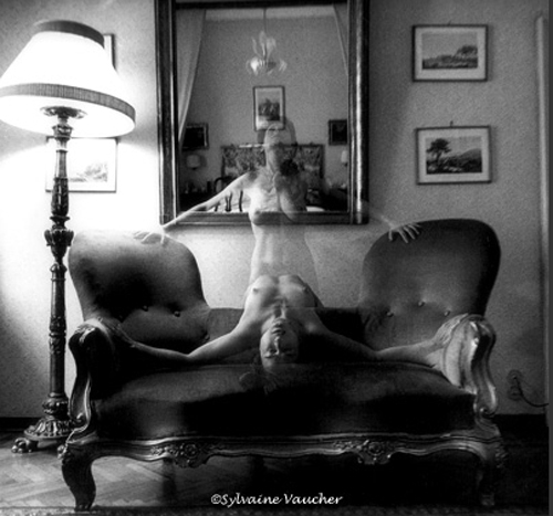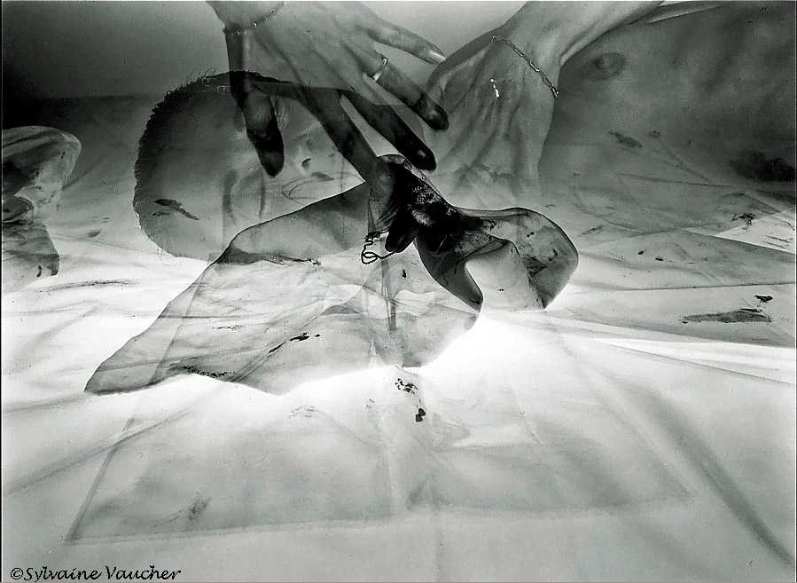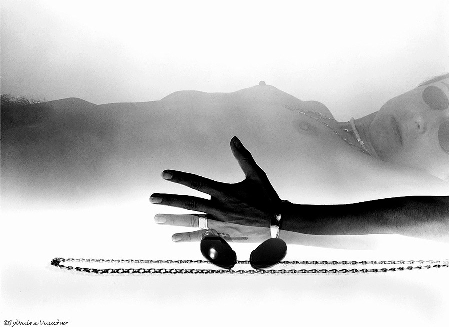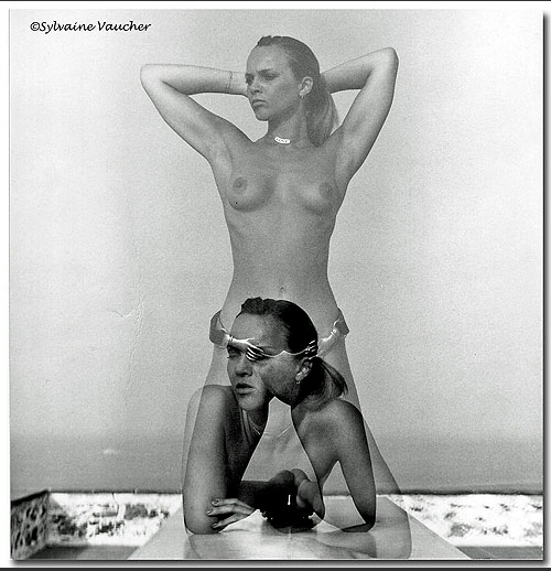 Sylvaine Vaucher: J’ai utilisé la technique traditionnelle ayant eu mon propre laboratoire et studio photo. Maintenant je ne fais que de la photo digitale et photoshop est mon laboratoire. Mais je préfère l’ancienne méthode surtout pour le Noir&Blanc. Me manquent ces instants d’intimité, le parfum des acides, la magie du développement, de l’agrandissement, toute cette alchimie nichée dans la chambre noire. En revanche je ne regrette pas l’appareillage lourd et sophistiqué du matériel de studio. C’était cher et lourd à porter. Le numérique lui est léger et peu encombrant et l’investissement est d’un moindre coût. (Je précise que dans mes autoportraits et doubles expositions sur le même négatif, j’étais reliée à un câble, sorte de nombril élastique !)