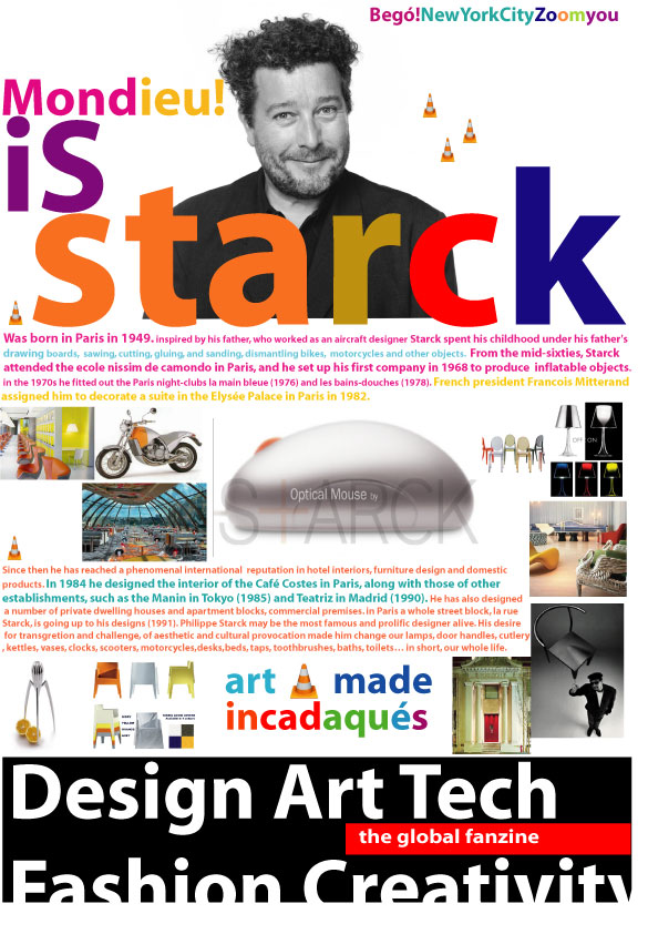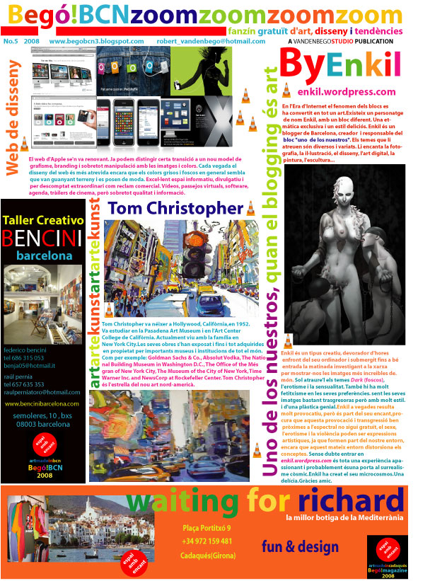 Robert Vandenbego: El contenido es sencillo. Sólo contenidos sobre el mundo del arte y del diseño. Reportajes sobre diseñadores, artistas, noticias…todo muy visual y cargado de color. Queremos ayudar a difundir el arte y el diseño entre todas las personas. Dicen que el trabajo dignifica al Hombre, pero no estoy nada de acuerdo, lo que realmente dignifica al ser humano es la creatividad desde pintar un cuadro, proyectar un edificio, crear un logo o simplemente diseñar una silla. Diseñadores como Philippe Starck, Ron Arad, Javier Mariscal, Karin Rashid, Zaha Hadid, pintores como Jean Michel Basquiat, Roy Lichtenstein, Keith Haring, Pere Bellès…ellos sí que dignifican nuestra especie. Quizá suene muy ególatra pero «Los diseñadores existimos porque nuestro trabajo se basa en corregir el mal trabajo de Dios». Existe una sinergia entre el diseño y el arte…eso mostramos en el fanzine. La chusma gracias a la globalización nos ha cercado. La cultura no está de moda, ni el diseño, ni el arte, ni siquiera la creatividad en general. Tu propio blog, enkil, es para minorías que nos apasiona la creatividad. Que nos gastamos una pasta en libros y revistas sobre grafismo, sillas, pomos, colores…decoración, fotografía. Jo es que me estoy calentando…