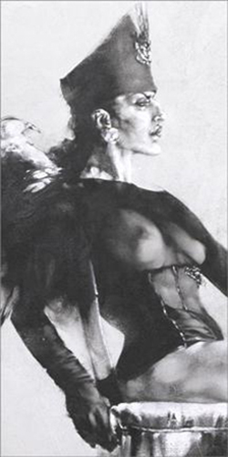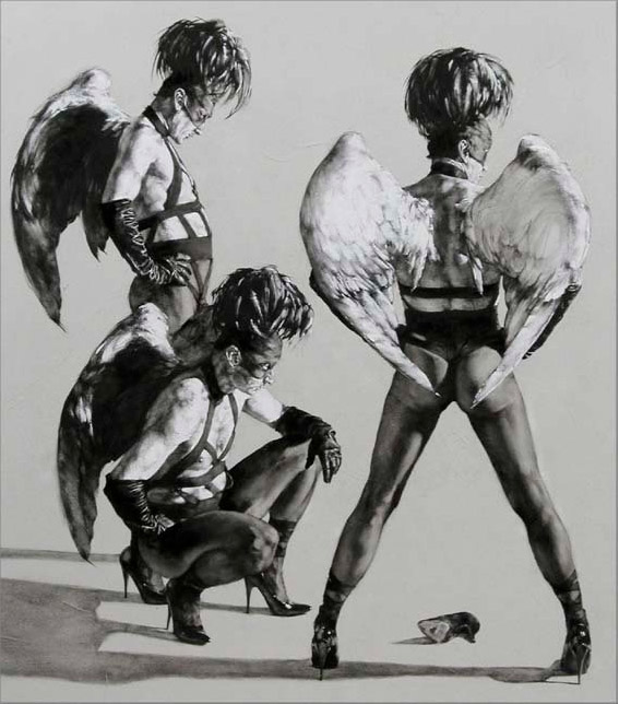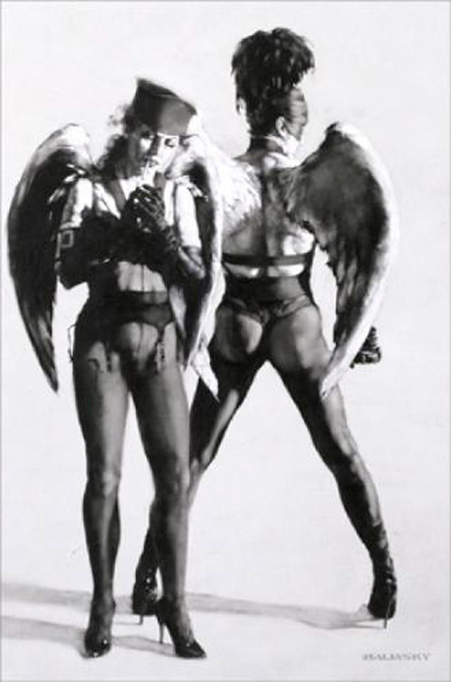 Ay, que bien que hayas rescatado a Malisky. Hacía tiempo que le había perdido la pista, pero sus representaciones angelicales en claro/oscuro son inconfundibles. Ese personaje masculino, con alas blancas, máscara, penacho de plumas y esas envidiables piernas tan femeninas, me encanta. El juego de dualidades es lo que más me gusta de este autor. La esencia del blanco y negro. Cara y cruz.