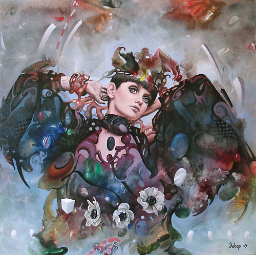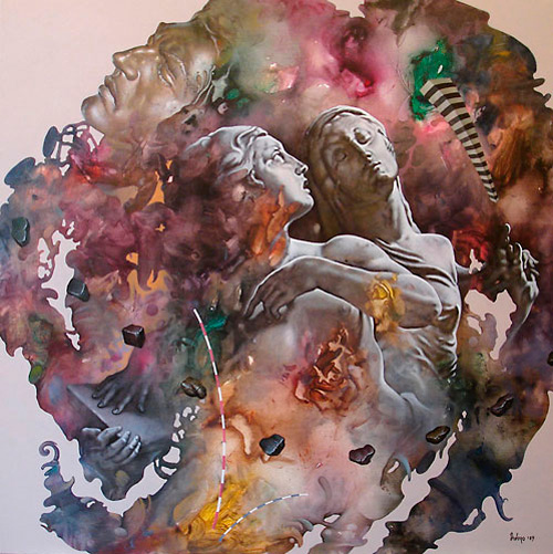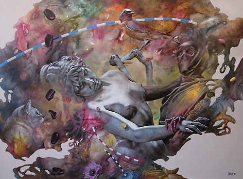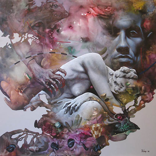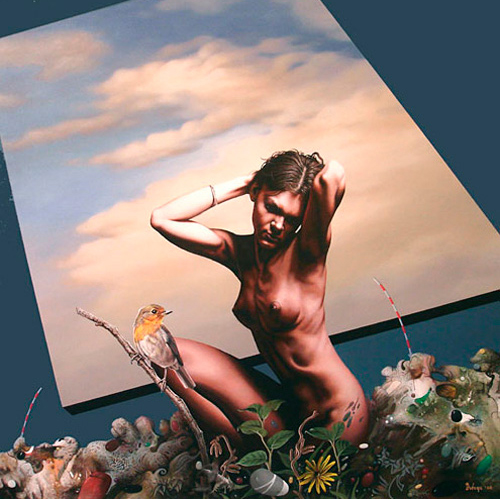 Hemos seleccionado su obra más reciente y tal vez la más compleja, pero su web nos deja una extensa muestra de su trabajo, a menudo cargado de referencias mitológicas y guiños a la escultura, mezclados con pájaros y gatos que se asoman aquí y allá en contraste a la frialdad de las figuras escultóricas, mientras que la imagen femenina domina el centro de toda su obra.