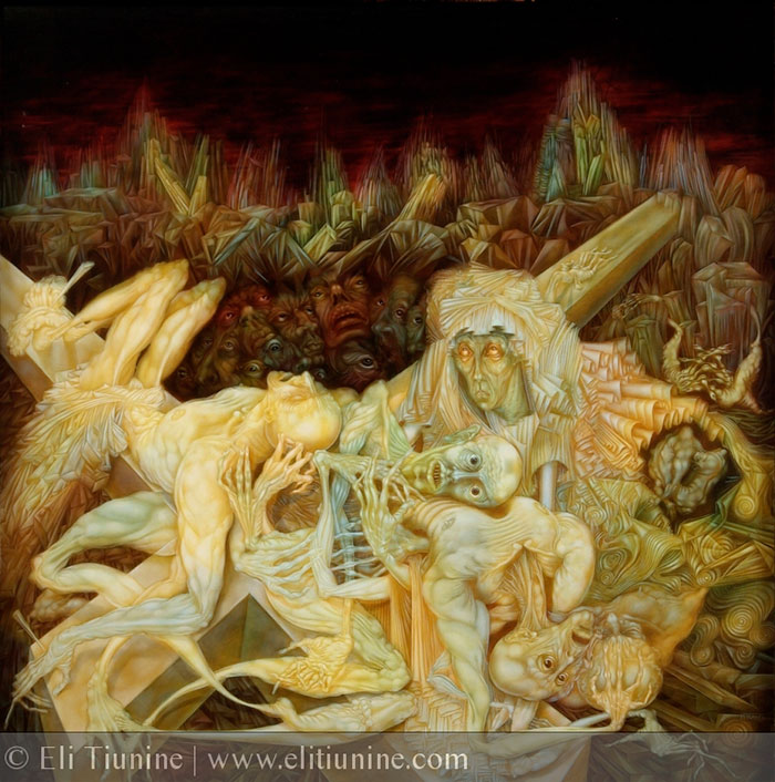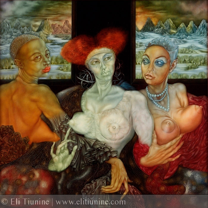 Admiradora de antiguos pintores (Van Eyck, Maître de Flémalle, Memling, Van Dyck, Van der Hoch, Van der Weyden, Van der Goes, Pieter Breughel, Piero di Cosimo, Piero della Francesca, Filippino Lippi, Robert Campin), Eli Tiunine se compromete a través de su trabajo a una búsqueda personal dentro de estas técnicas -soportes, colores, pigmentos- que permiten el florecimiento de su propia expresión. A través de su pintura, Eli Tiunine nos ofrece una visión muy personal de los mitos en los que se sustenta nuestra civilización estableciendo un contacto directo con las realidades de nuestro tiempo.