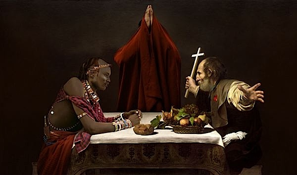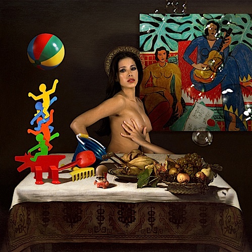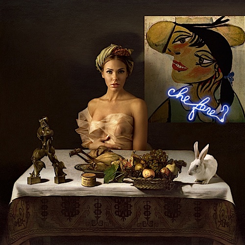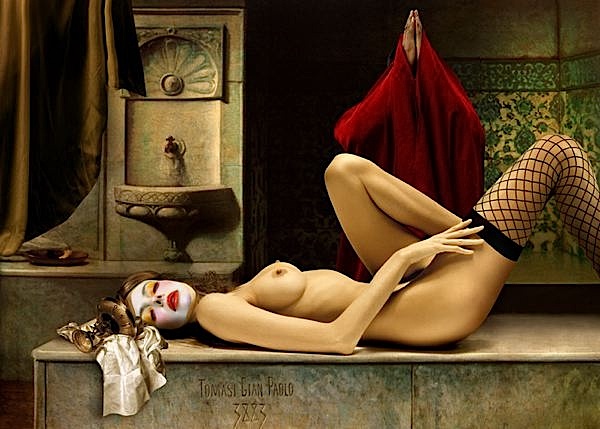 La fotografía de Gian Paolo Tomasi rompe muchos reglas establecidas, o más bien supone la evolución natural de una realidad que ya no nos es desconocida. Sus obras son de pigmentos puros sobre telas, imágenes multimedia hechas por ordenador y colocadas en lienzos. Tomasi crea sus propios cuadros en un acto de técnica digital donde el modelo es virtual, pero la simbología no ha desaparecido (máscaras, objetos, iconos…), ni tampoco el mensaje. Su creatividad se apoya en los clásicos utilizando herramientas modernas. No importa si ese mundo es virtual o real, su intención es armonizar, comparar, encontrar un símil, poner en pie de igualdad los distintos movimientos artísticos. Sus fotografías parecen pinturas igual que las pinturas hiperrealistas parecen fotografías. Del mismo modo pueden ocupar un lugar en esa frágil jerarquía del arte que cada vez es más difusa. El nuevo arte cuenta además con una ventaja añadida, y son las nuevas galerías y métodos de divulgación. Internet, la red de redes.