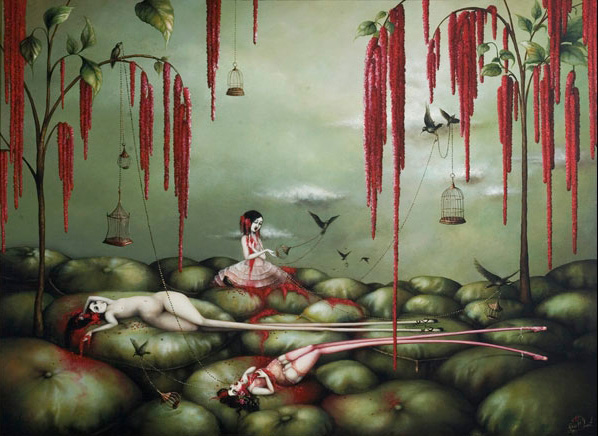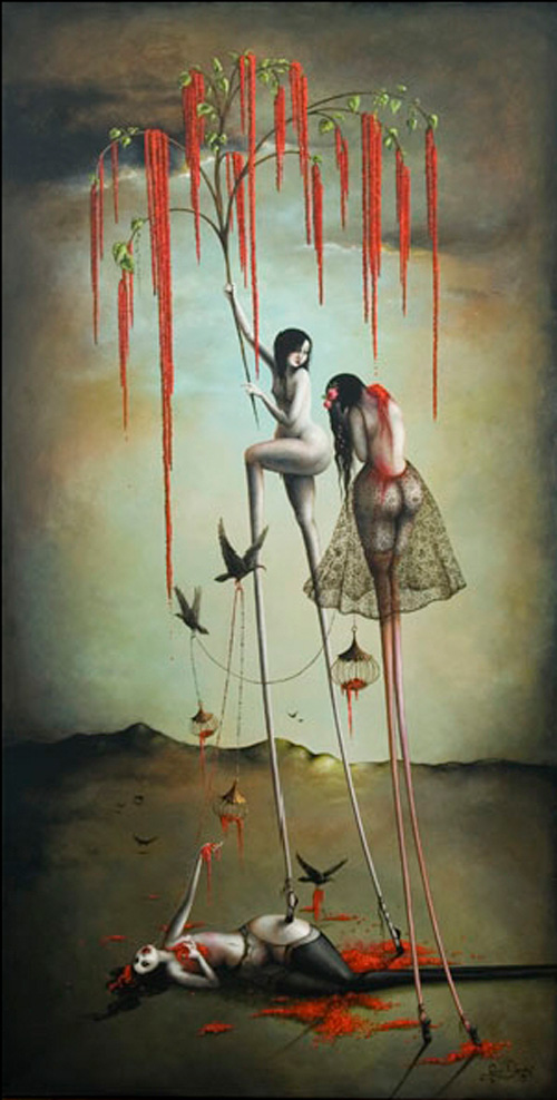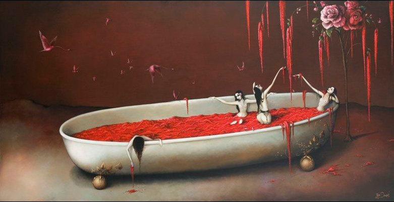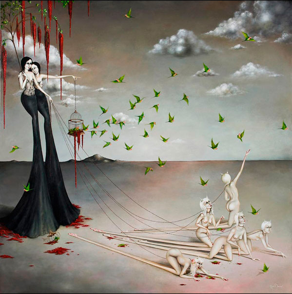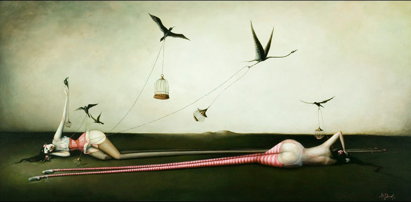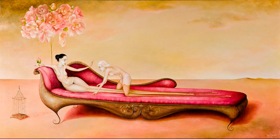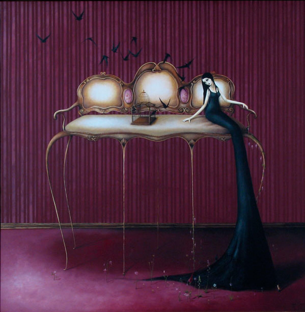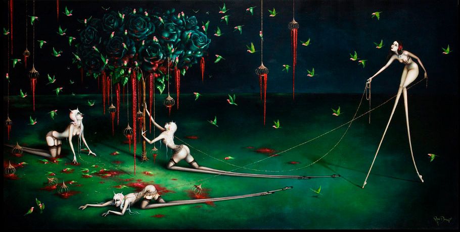 Mujeres de infinitas piernas y sexualmente provocativas se muestran desnudas o con fina lencería vintage rodeadas de una gran simbología representada con jaulas vacías, flores, murciélagos, cuervos, flamingos o paraguas. Escenas donde la mujer aparece frágil y hermosa pero sufrida e inalcanzable. La sangre y algunos elementos bondage también hacen acto de presencia en estas bellas y oscuras escenas que Demant nos presenta en sus pinturas llenas de dulzura y decadencia a la vez.