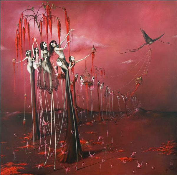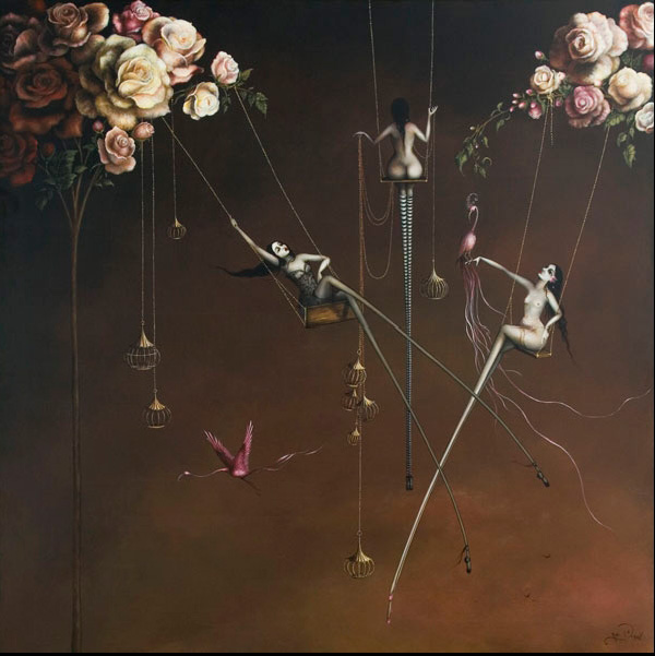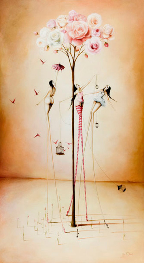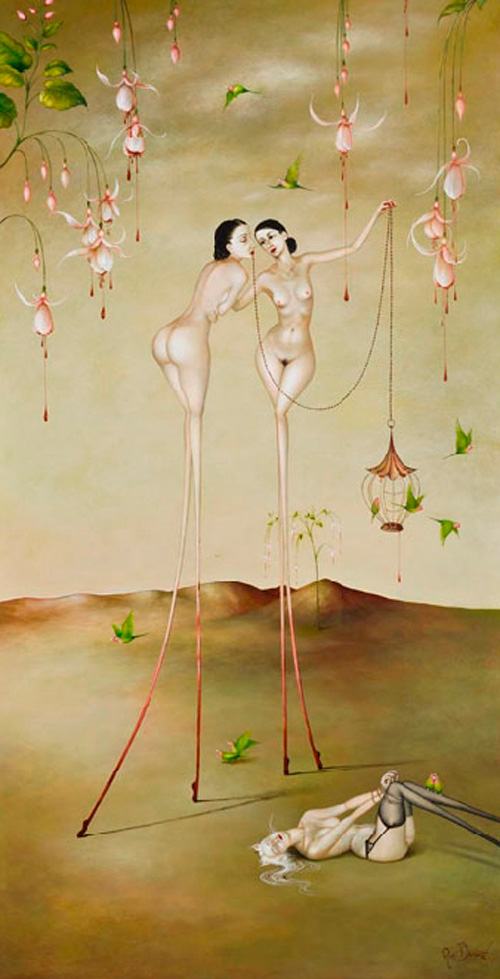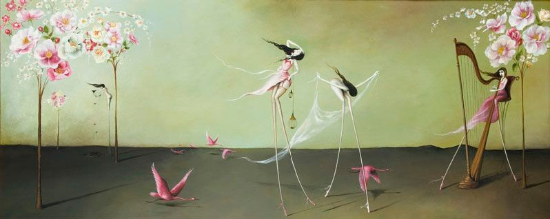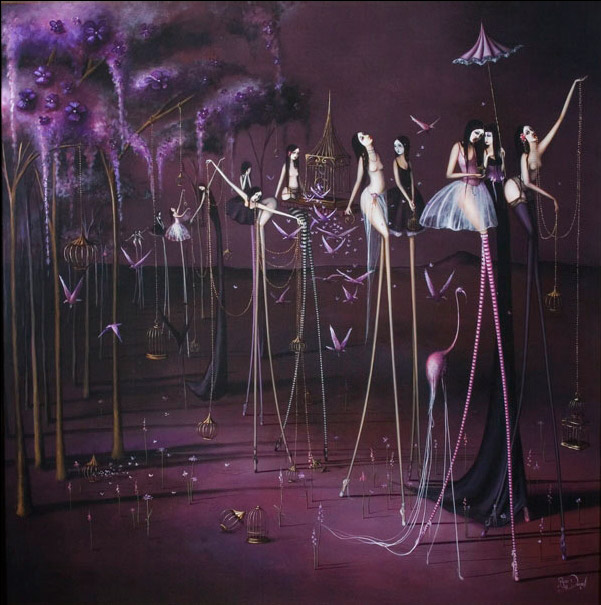 ¡Son bailarinas! ¿no? quizás eso es lo que me transmite una sensación de libertad y música. Los fondos en que ubica a sus personajes son magníficos y la luz que consigue casi obliga a no dejar de mirar. La representación de las jaulas y los pájados me ha recordado, aunque tenga otro estilo, a Caia Koopman que también nos hablaste aquí. Bsos.