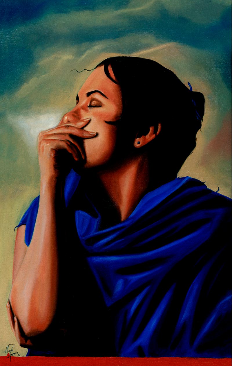 Dramatismo, exorcismo del pathos. Esos son los juegos cromáticos con los que se expresa Marco. En él no cabe el termino medio, la prudencia, la tibieza. Cada cuadro no es solo un manejo histérico del color en claroscuros, es un juego de simbolismos, de historias cruzadas, de pasiones que se desbordan. Los trazos dicen más de lo que presentan. Por lo que también hay un juego del ocultamiento que invita a ser develado. La realidad presentada no es solo una petulancia de atrapar un momento, es una irreverencia en develar secretos solo para iniciados. Si es realismo no es por lo que muestra con intención fidedigna del modelo, sino porque en su decir, vuelve realizada la lucha purgativa entre el cielo y el infierno pasional.