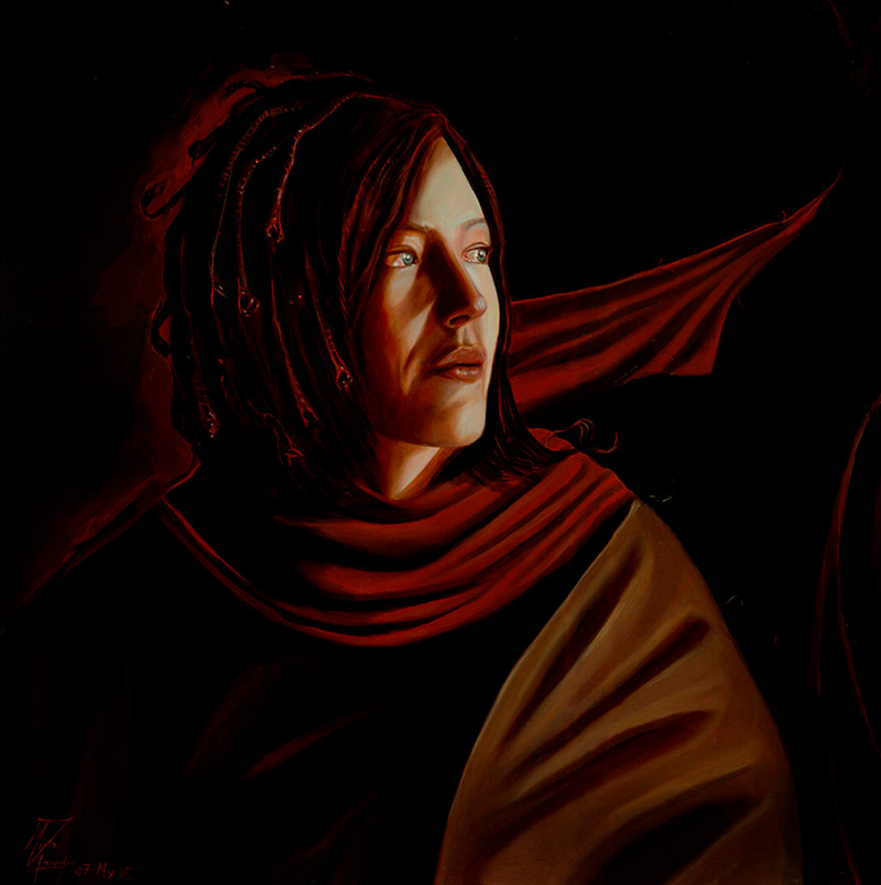 enkil: Aunque tus cuadros poseen una delicada paleta de colores cálidos en tus personajes, el trasfondo, el conjunto en general nos ofrece un aspecto algo oscuro y a veces perturbador. ¿Qué significado tiene este contraste entre luz y oscuridad?