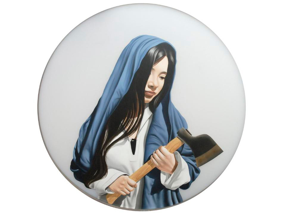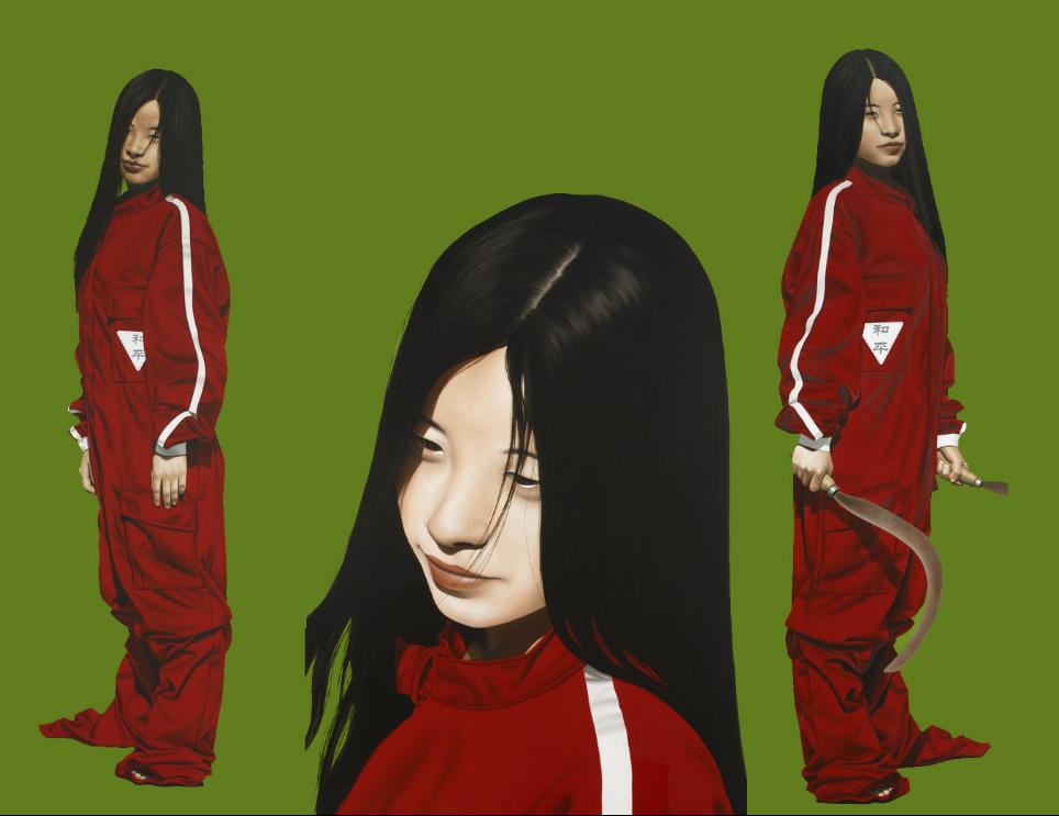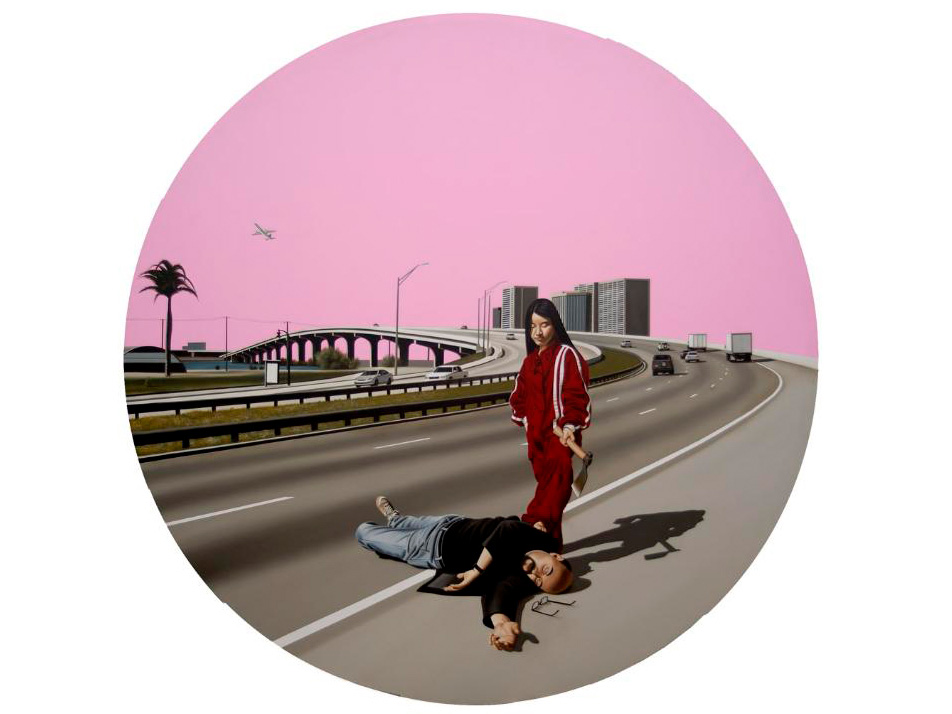 Xevi Vilaró: No, en la mayoría de obras los fondos son una simple combinación estética, en algunos si que busco algo mas, como en el cuadro que hay una chica asiática con una hacha y un tío tumbado en el suelo, ahí el cielo no es azul es rosa y el cuadro lleva el titulo de: LOVE! El rosa es el equilibrio de lo violento que el cuadro lleva, si el cielo estuviera pintado rojo o negro seria muy distinto mas agresivo y no quiero tanta oscuridad.