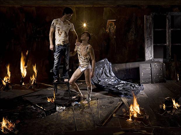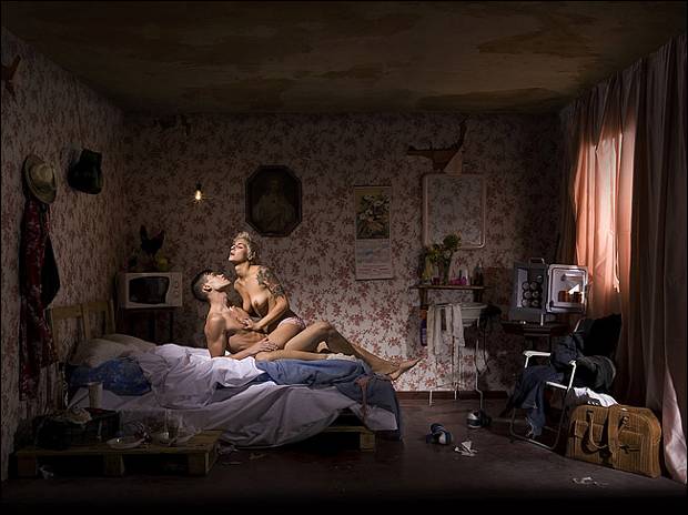 En su web encontraremos su trabajo dividido en varias series, que también han pasado por diversas exposiciones. En cada una de ellas hay una introducción a modo de prólogo explicativo, para dar paso al mundo mágico, extraño y simbólicamente real de sus fotografías. En ellas se aprecia la labor de producción, la técnica y una clara intencionalidad creativa. Tiene una web dinámica que te permite interactuar por toda la página descubriendo diferentes espacios, como su blog o behind donde nos muestra imágenes de su equipo y todo el atrezzo, muy interesante. También encontramos secciones de donde hemos sacado el texto para completar el post y que se pueden leer o descargar. Sus series se pueden disfrutar perfectamente por separado o como continuación de una misma historia, la historia de un contador de historias. Aunque su última exposición ha traído una algo inexplicable polémica, conocer el conjunto de su trabajo nos hace llegar a la conclusión de que estamos ante un artista con un criterio y un estilo propio y bien definido que parte de una labor creativa para expresar sus inquietudes y las de muchos otros.