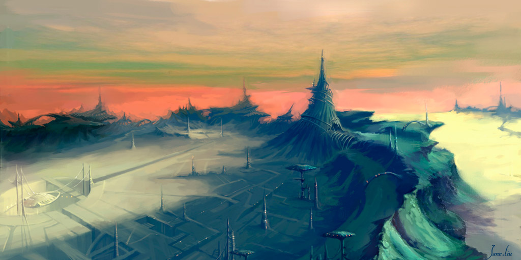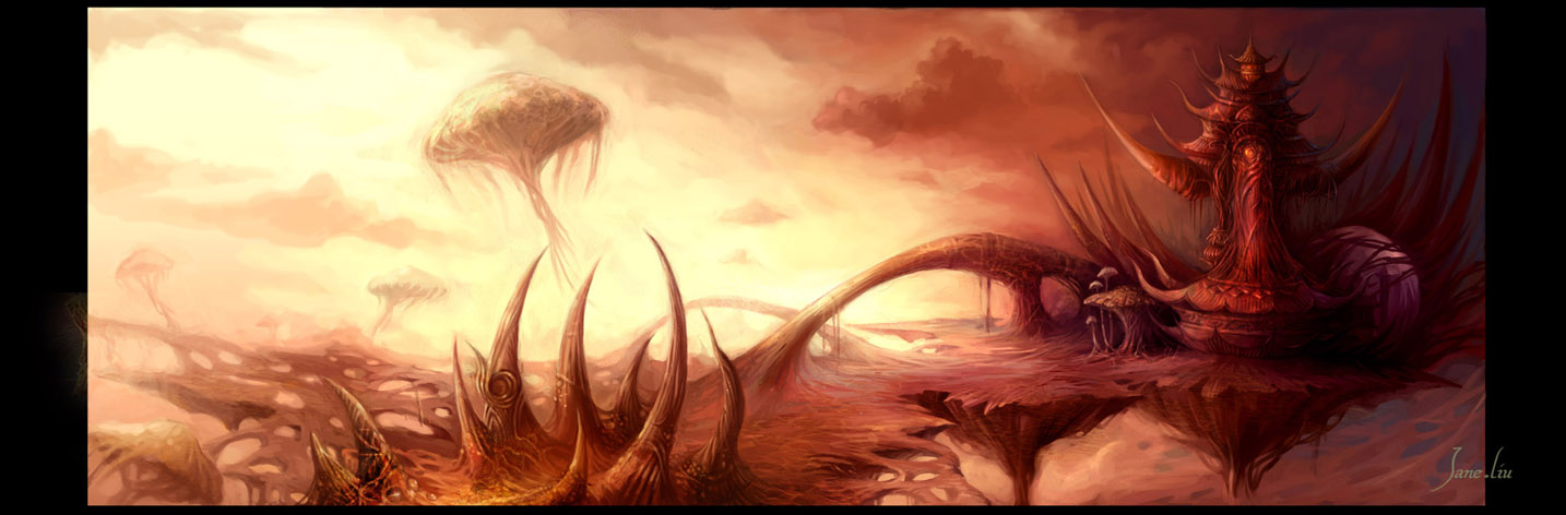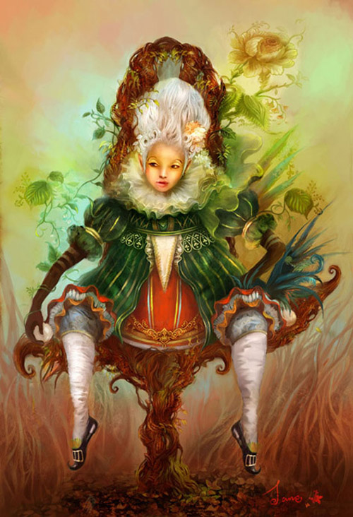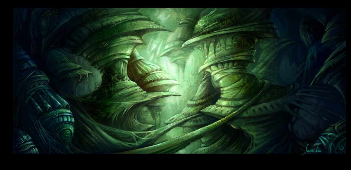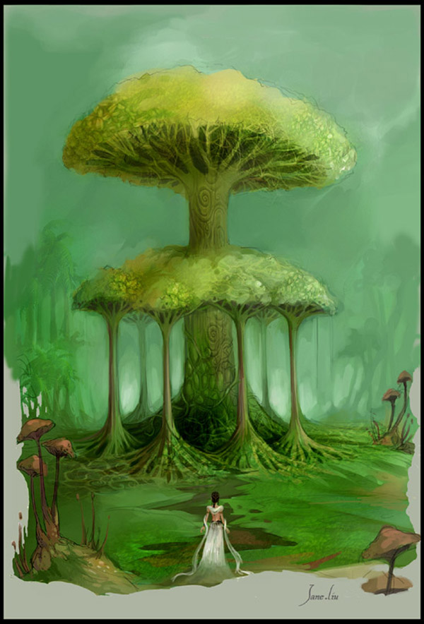 Jane Lin es la parte femenina de Chain and Jane. Aunque en su trabajo también encontramos algunos personajes, ella se especializa más en la creación de esos mundos fantásticos mitad vídeo-juego mitad fantasía Avatar. Mundos exóticos con algunas reminiscencias a culturas alpinas. El empleo de la paleta de colores también es espectacular aunque muchas veces sus mundos están sumidos en las sombras que producen espesos bosques. Un complemento perfecto para un gran trabajo en equipo.