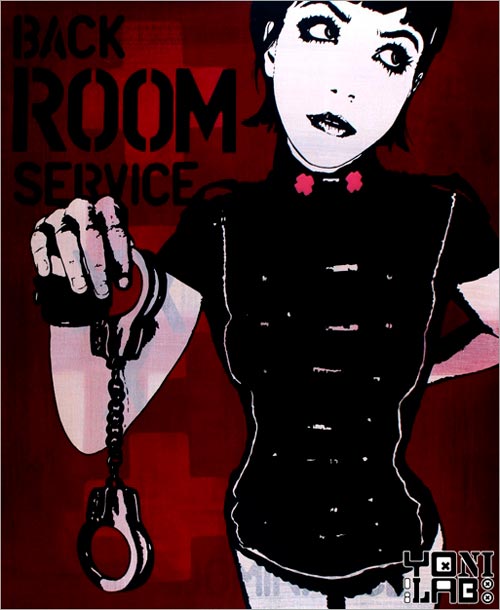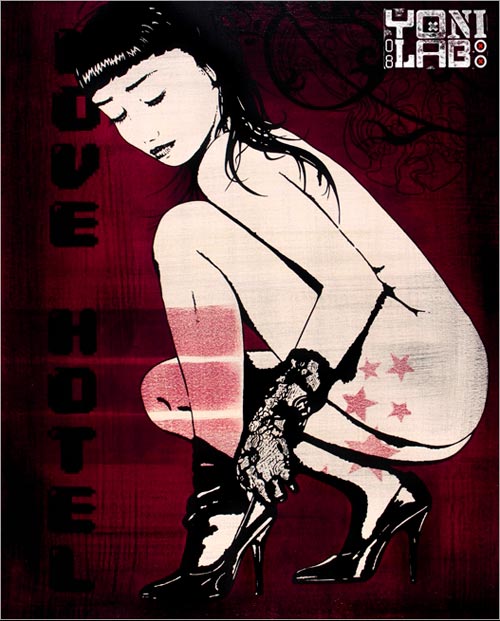 YoniLab basa sus composiciones en fotografías de mujeres que el mismo ha fotografiado, de otras con las que intercambia imágenes a través de su MySpace, y de imágenes eróticas o pornográficas que se descarga de la red. A partir de ahí viene la transformación a través del ordenador, de la pintura… todo es remezclado para crear sus peculiares personajes y dar forma a sus lienzos.