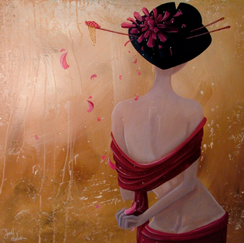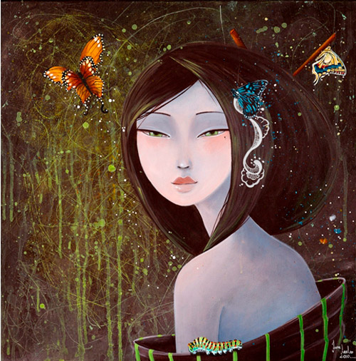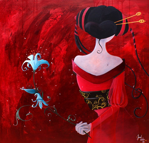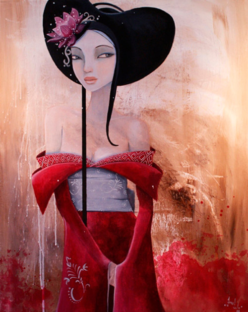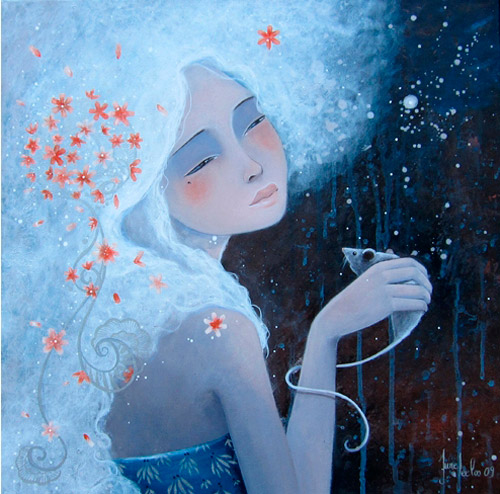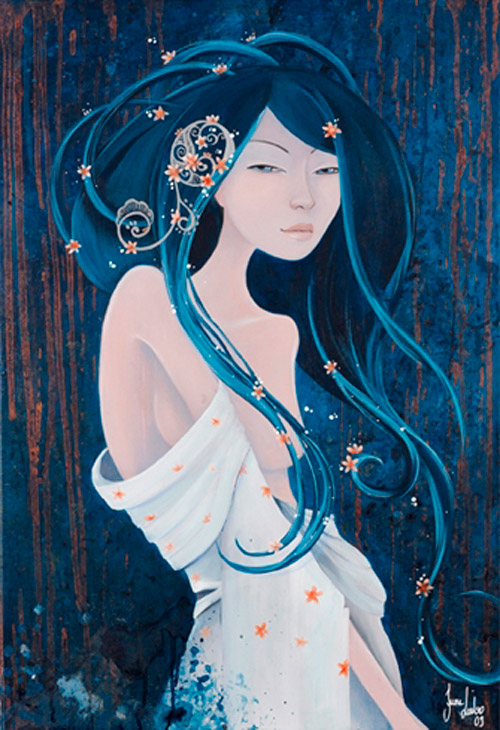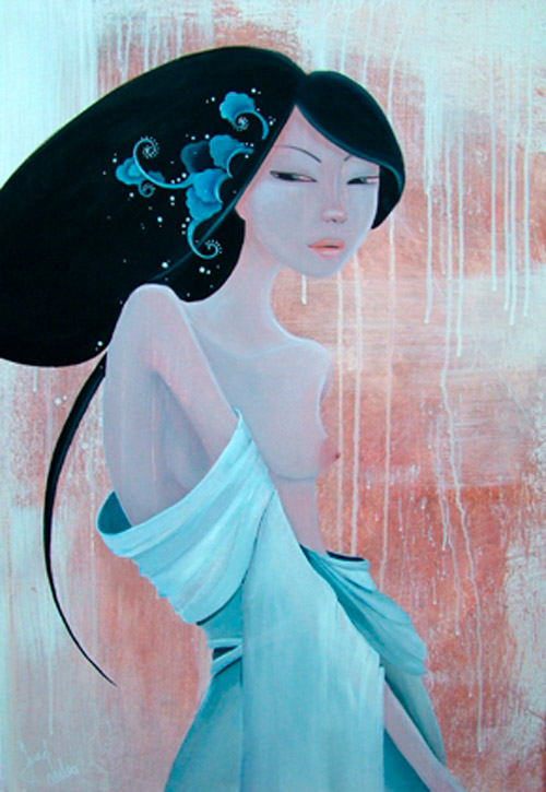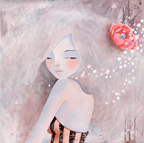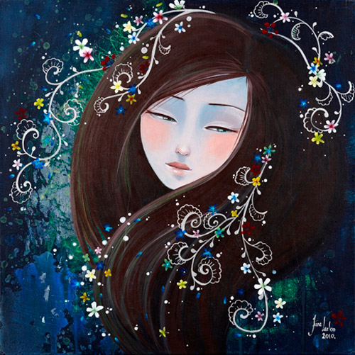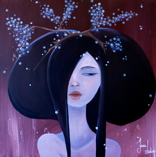 El tema representado en los acrílicos de June Leeloo es principalmente la mujer, a la que ella presenta sensual y sutilmente erótica, pero también con un halo de misterio y cierta melancolía, como perdidas en sus propios pensamientos. Siempre están asociadas con una flor, o más recientemente con algún animal. Además de su web, June nos cuenta también con su blog y su página en MySpace.