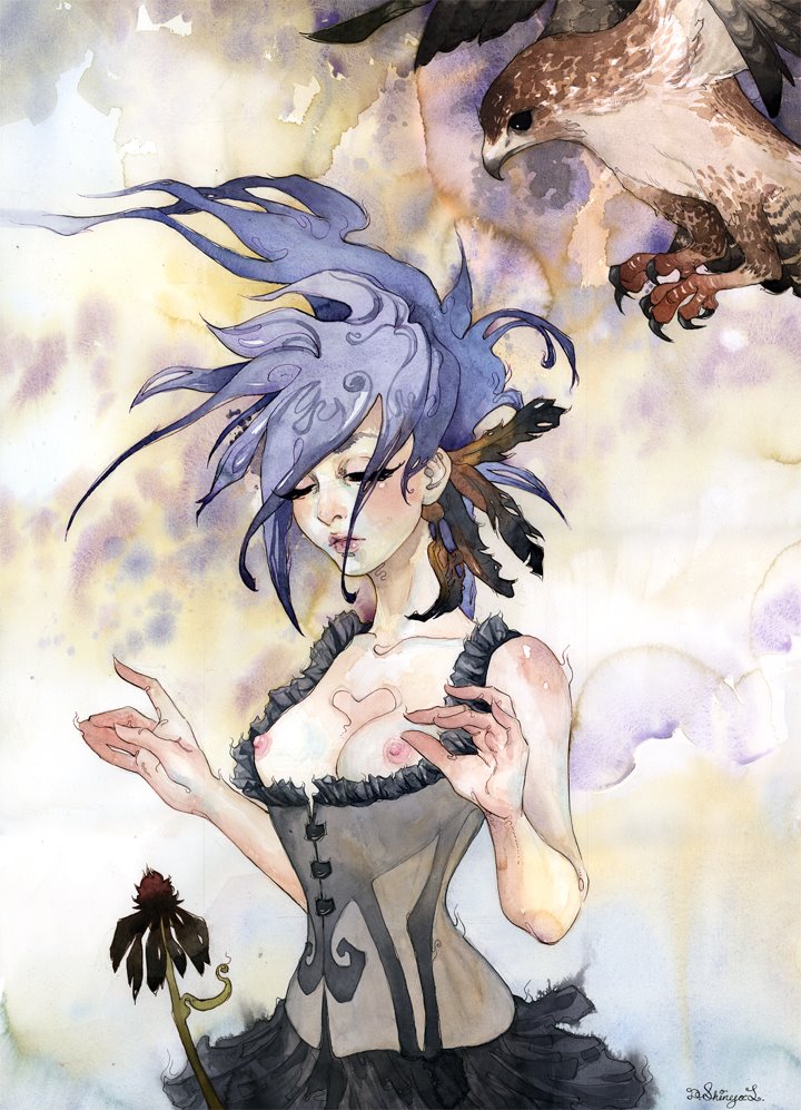 Además de sus ilustraciones, también realiza animaciones flash y diseño como freelance. Trabaja principalmente con acuarelas, tinta y cera, pero dependiendo de la pieza incorpora una mezcla de otros medios de tanto en tanto. Aparte de su galería personal también realiza obras digitales. Tiene su página de MySpace y podéis leerla en esta entrevista (en inglés).