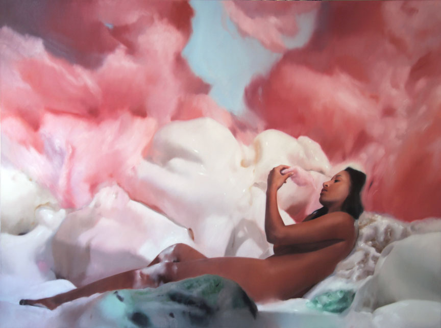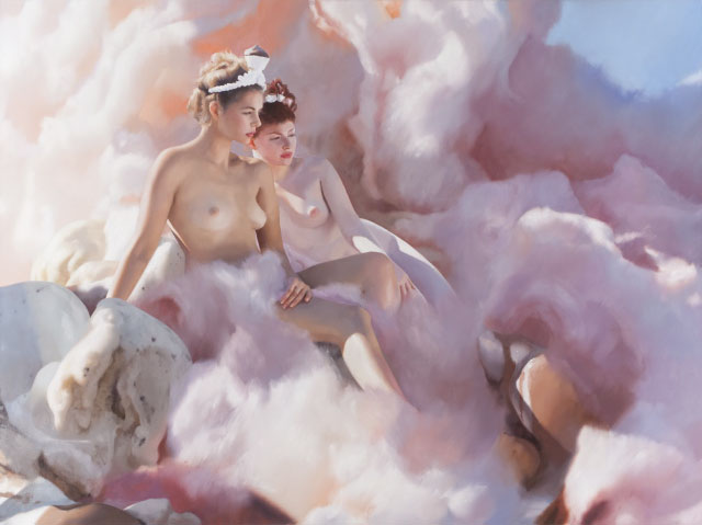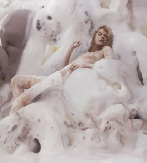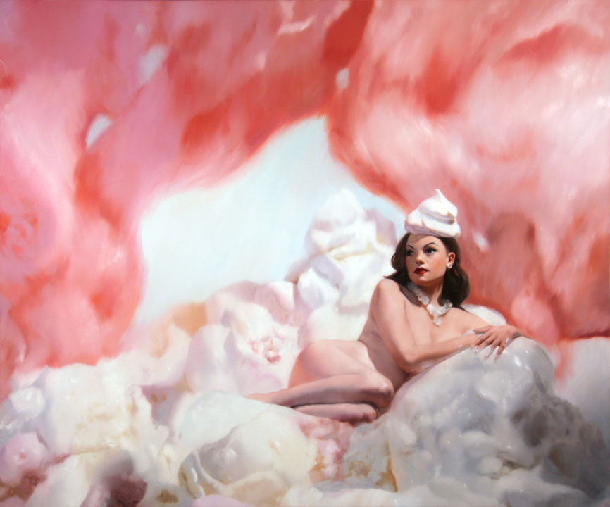William Cotton es un pintor norteamericano nacido en Melrose, Massachusetts en 1965. Actualmente vive y trabaja en Nueva York. En su obra encontramos una relación directa entre los sentidos de la vista y del gusto. Sus pinturas se mueven entre el erotismo onírico de sus mujeres desnudas y los pasteles, algodones y otros dulces que protagonizan una buena parte de sus trabajos. Ellas posan con extrema sensualidad entre nubes de algodón o lucen extravagantes coronas de caramelos como si de las reinas del mundo de Hansel y Gretel se tratasen.
