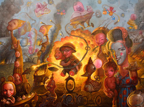 El humor es importante, y se utiliza tanto como un medio para un fin, como un fin en si mismo. Se suaviza el golpe de las trágicas circunstancias, o crea un sentido de la ironía. El humor atrae a la gente, es una entrañable cualidad en esas circunstancias incómodas. La yuxtaposición resultante del humor y la tragedia a menudo causa confusión y enojo. Incluso en mis piezas más serias el humor existe en algún nivel, aunque sólo sea como un recordatorio de que no nos tomemos demasiado en serio. Mi trabajo es figurativo. Es accesible y facilita la comunicación. Es un lenguaje comprensible, y como la danza, la narración se crea sin palabras. Las historias contadas en el número infinito de rostros, gestos y cuerpos que me rodean son inspiradoras y me proporcionan un suministro sin fin de material para trabajar.
