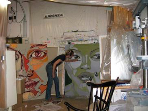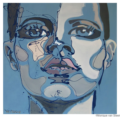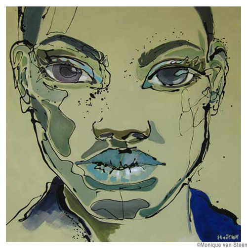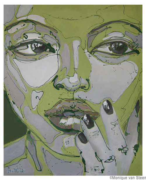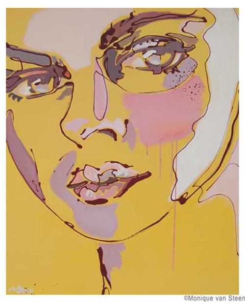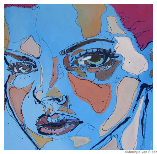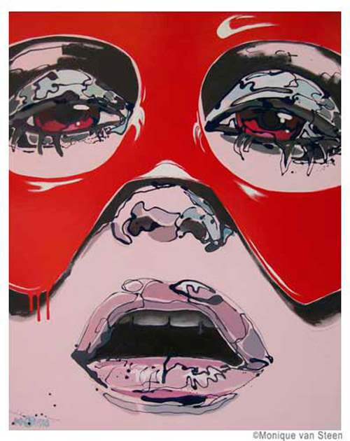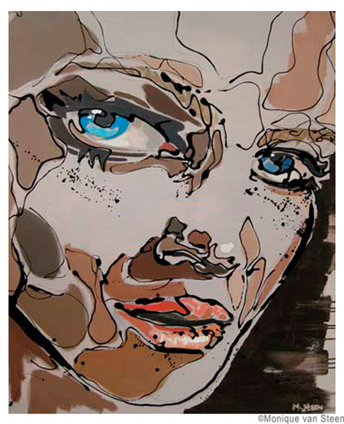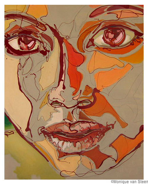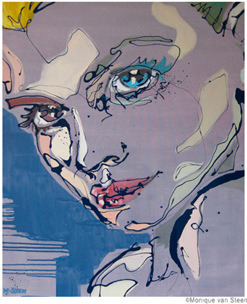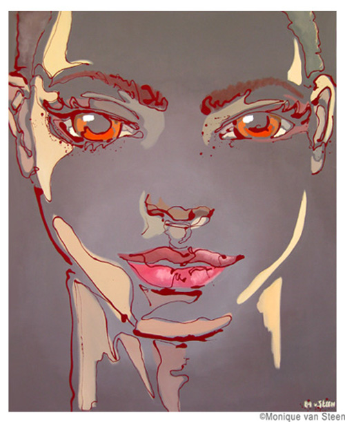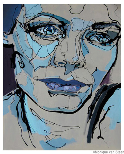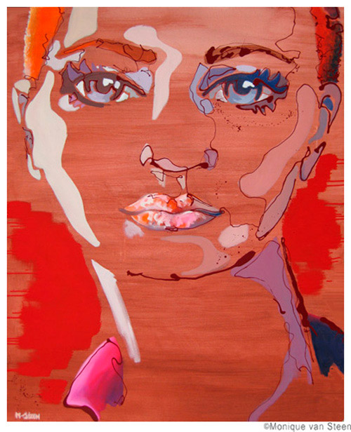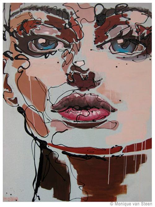 Monique van Steen es una joven pintora que nos presenta una visión personal de la belleza femenina aplicando una curiosa técnica llamada dripping. Sus retratos están cargados de expresividad y energía deformando y a la vez resaltando la belleza clásica de sus modelos. Tuve la suerte y el privilegio de ver su obra en directo en su taller y las miradas de sus mujeres cobraban una vida aún más explosiva y directa, penetrando en la piel y haciéndote cómplice de sus sentimientos y emociones. Los colores vibrantes y modernos de sus cuadros profundizan aún más las fascinantes miradas que te observan, seducen e intimidan. Una bella experiencia perfectamente complementada con la animada e interesante charla con la misma artista. Gracias Monique.