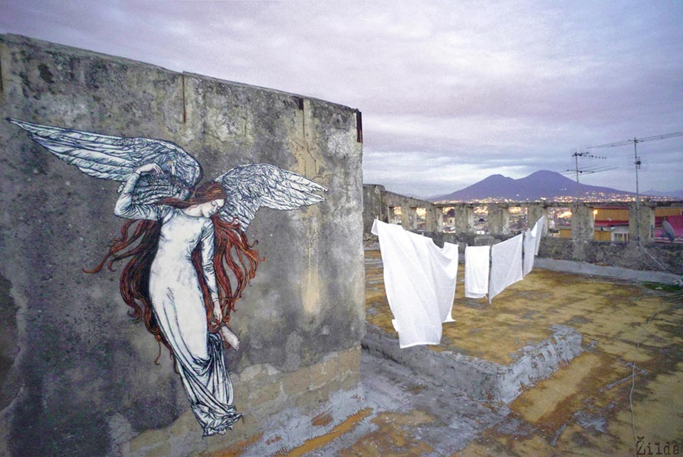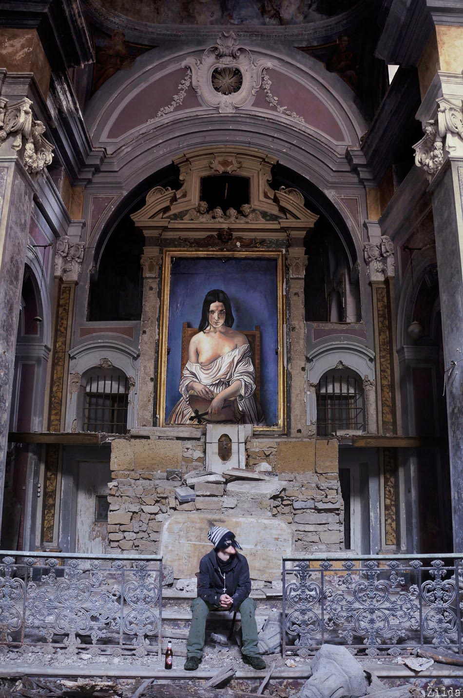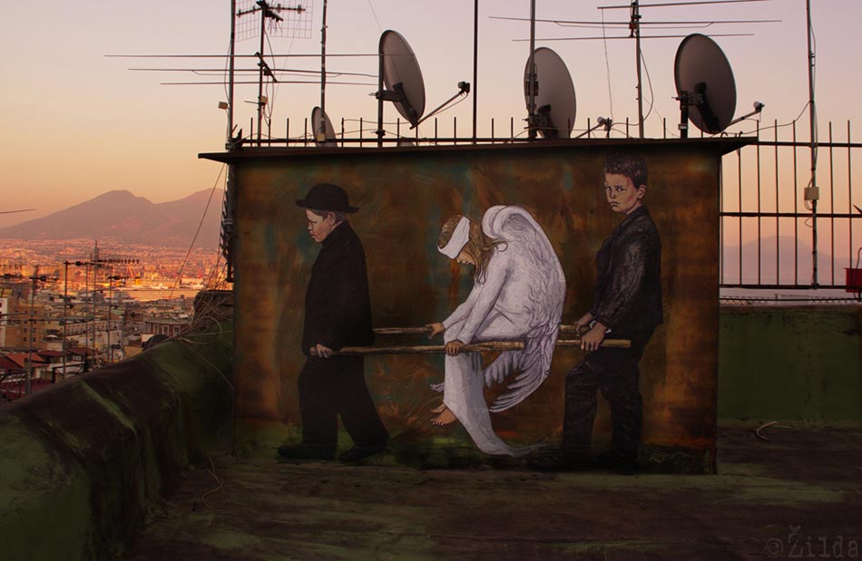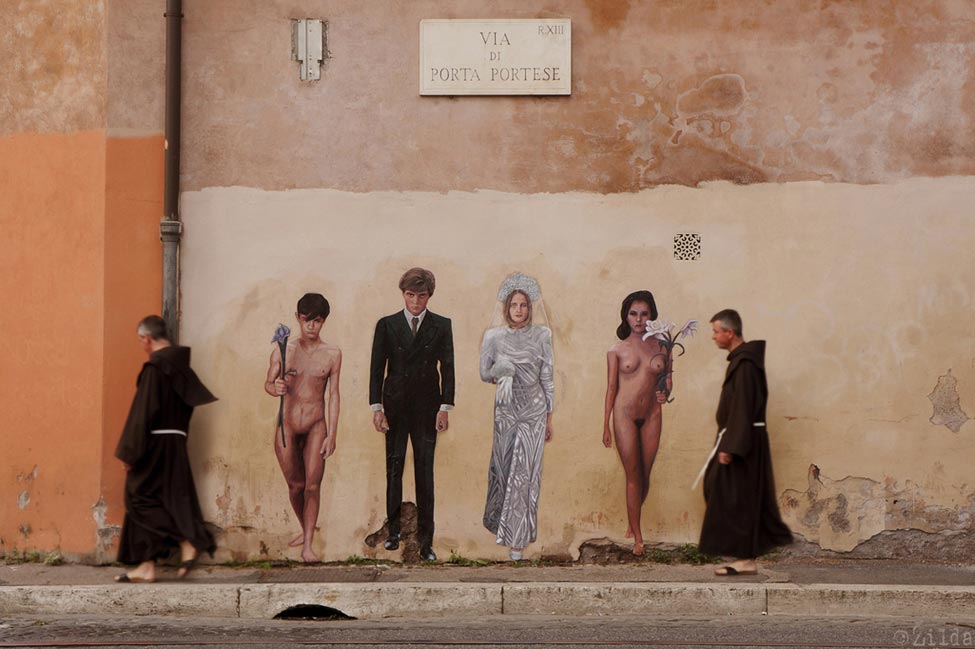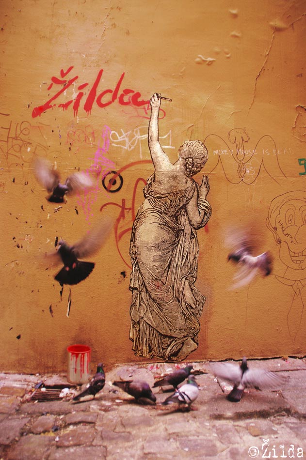 Žilda es un artista originario de Rennes, Francia, que lleva el street art a una nueva dimensión, fusionando los grandes clásicos del Renacimiento o las escenas del cine romano de los años 50 y 60, con escenarios propios del arte urbano contemporáneo. Con una elaborada técnica de pintura y pegado, sus obras son originalmente creadas en papel con acrílicos, óleos y acuarelas en su estudio, para más tarde ser adheridas en paredes y superficies de las distintas ciudades que recorre como Roma, París, Nápoles o Lisboa, normalmente en lugares abandonados y otros escenarios decadentes buscados con un propósito para nada casual.
