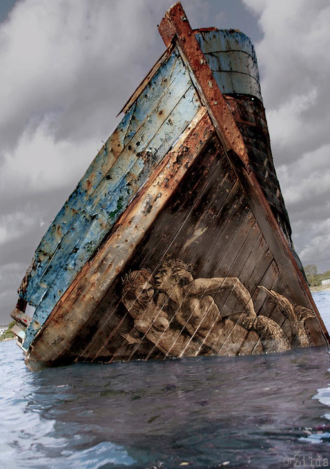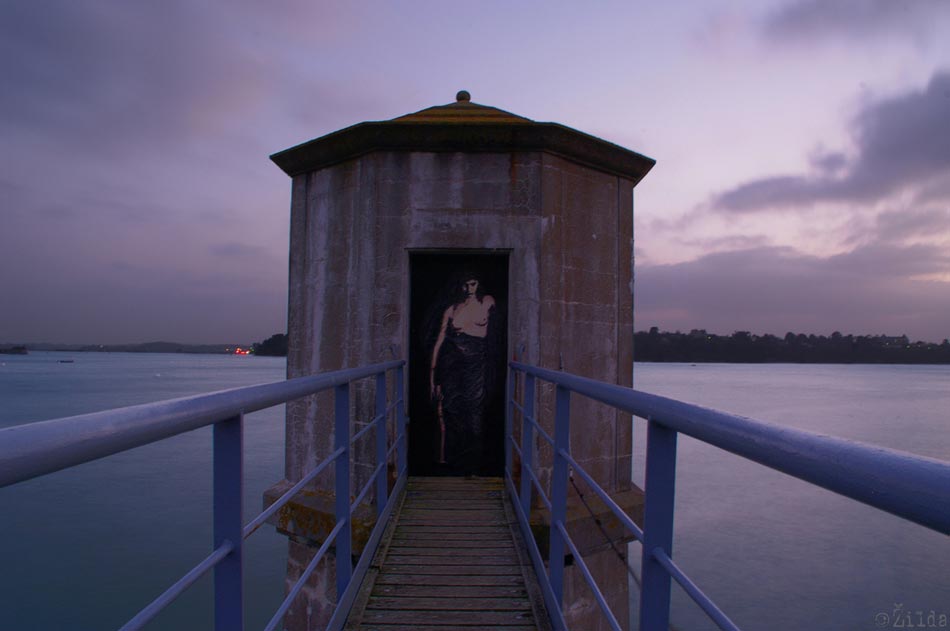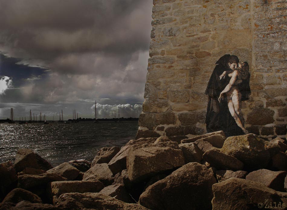 Las obras de Žilda suelen encontrarse en lugares de difícil acceso. Él no es muy partidario del posicionamiento del Street Art que busca legibilidad a toda costa. Lo suyo es sobre todo para complacerse, para contar historias en lugares que le hablan. Su pintura es efímera y desaparece con el tiempo, de ahí que la parte fotográfica marque un punto importante en todo el proceso. En una de sus obras, “Lorient” trabajo en una serie de pinturas instaladas un día de marea alta. “La idea era crear escenas en las que mis personajes tuvieran los pies en el agua y terminaran completamente tragados por el mar. Fue un paso completamente improductivo porque pasé meses trabajando en él para finalmente matar literalmente mis fotos apenas expuestas. Phrosine y Melidore tuvieron una vida tan breve que no fueron visibles para el público. Mi satisfacción realmente vino con la realización de esta escena.”