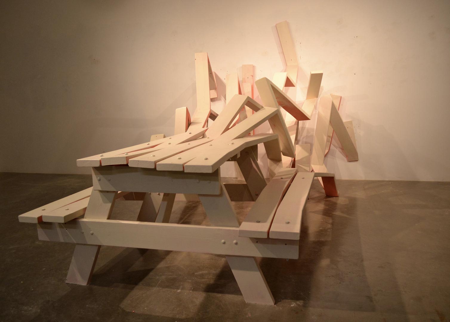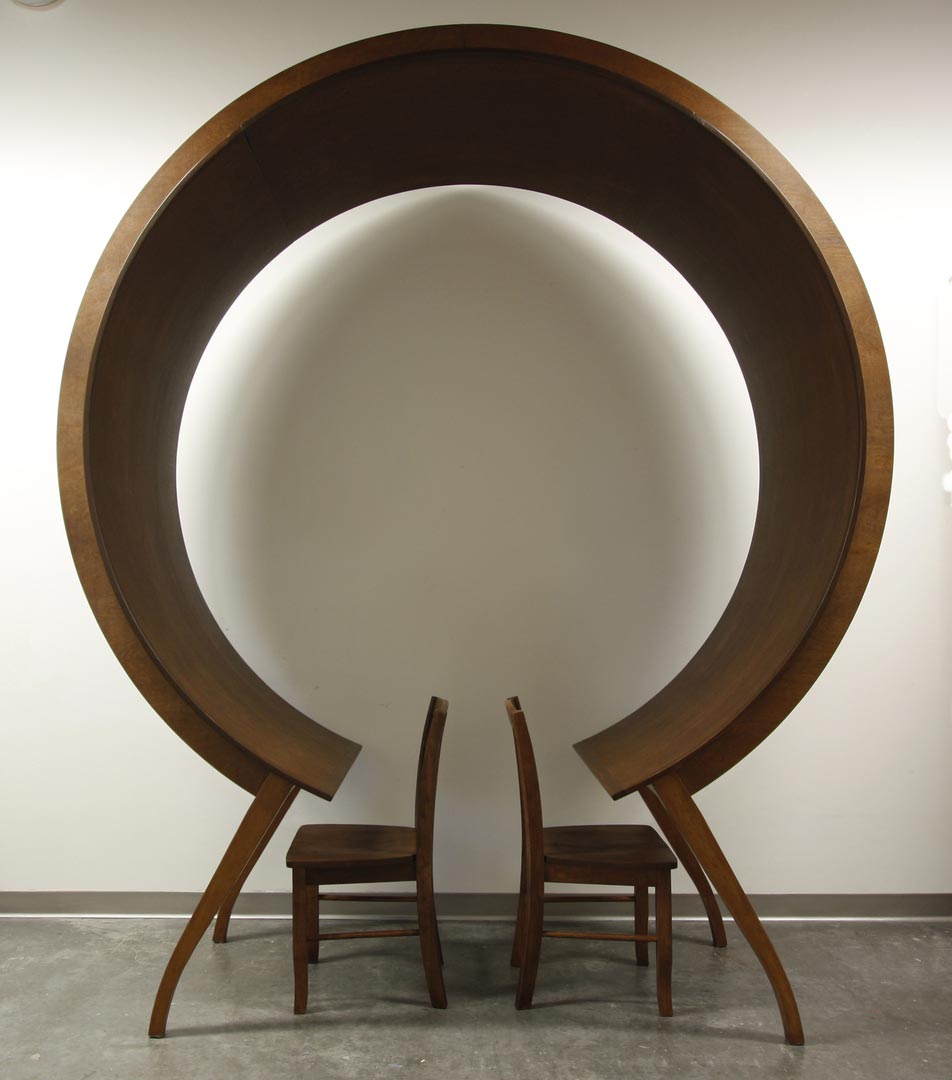 “Constantemente me encuentro mirando objetos mundanos o hacia el espacio. Simplemente no puedo creer cuán enfocada puede estar la gente durante largos períodos de tiempo. Ni siquiera tenemos tiempo para detenernos y mirar los objetos en los que confiamos para casi todos los aspectos de nuestras vidas diseñadas. Quiero ver todo, cada barandilla, paso, pomo de la puerta y bisagra. Estoy fascinado con los objetos y la consistencia de su forma y función. Después de hacer cientos de mesas de comedor rectangulares y circulares como fabricante de muebles, comencé a ver estos objetos como expresiones de funciones sociales que podrían modificarse para describir ciertas ansiedades o tensiones que ocurren en o alrededor de tales objetos.”