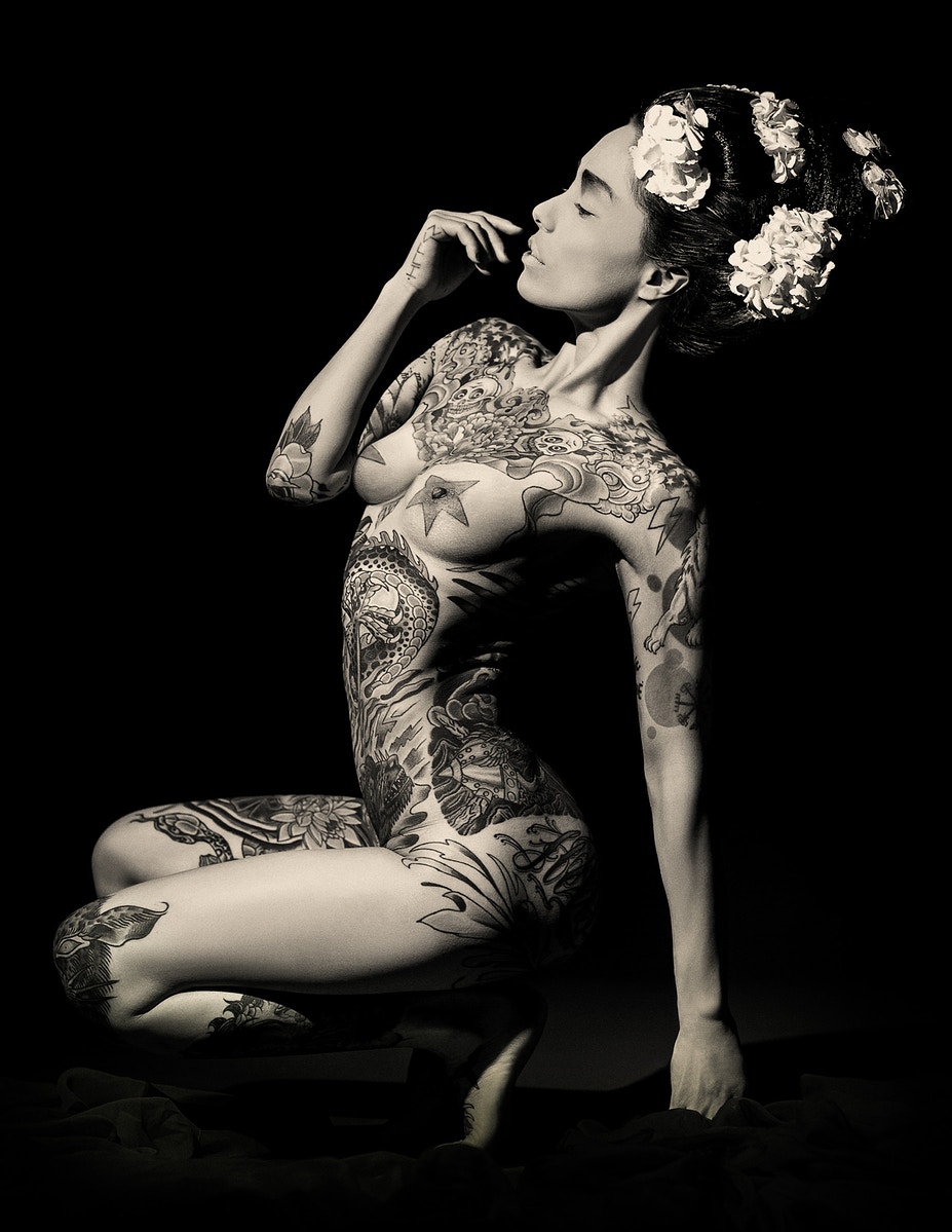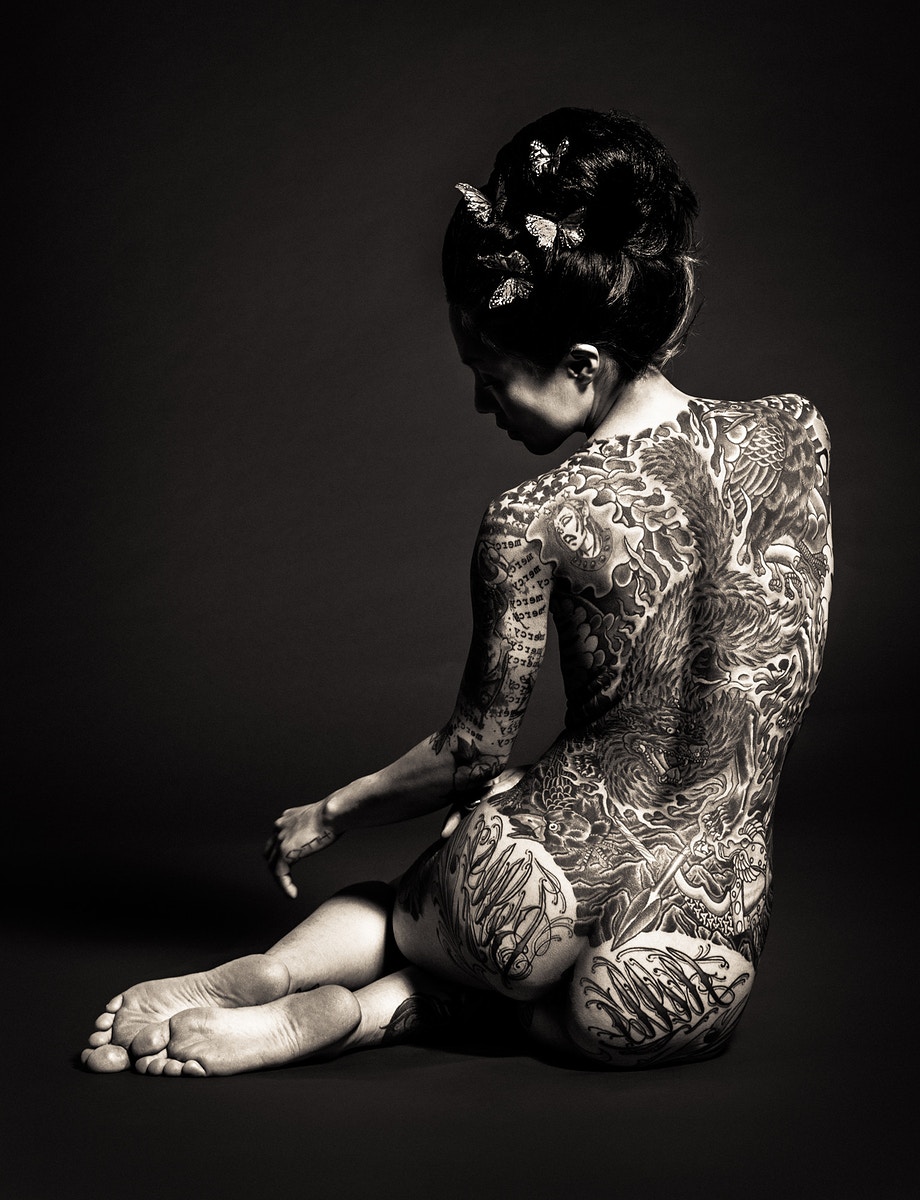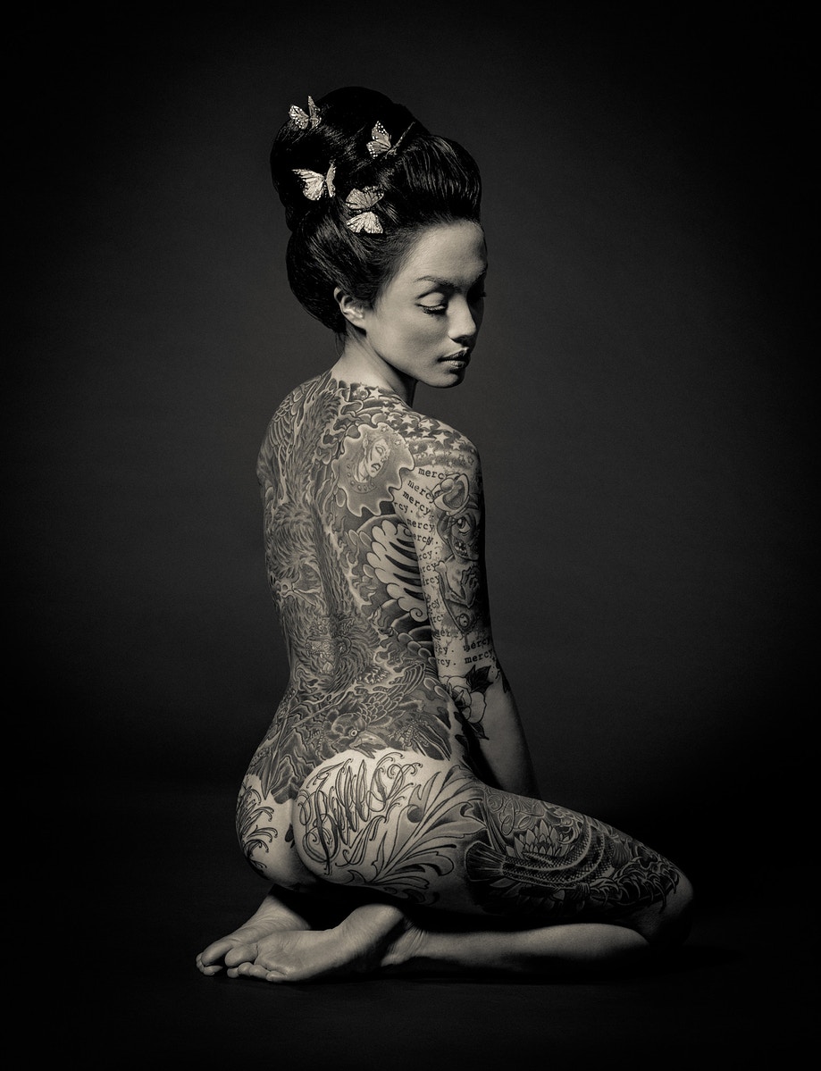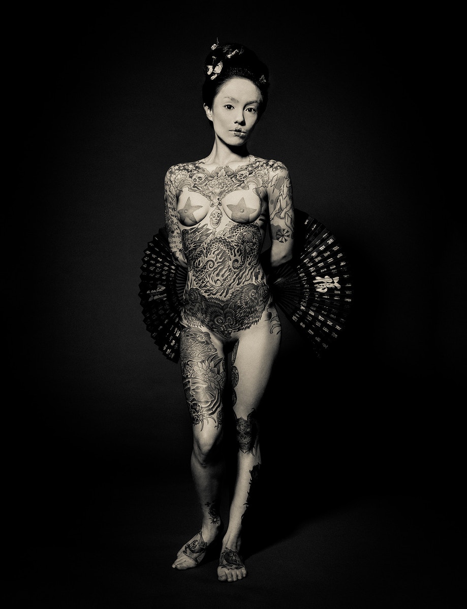 Asociados a la actividad criminal de las pandillas de Yakuski, los miembros se marcarían con los tatuajes de Irezumi. Debido a su proceso doloroso, Irezumju es considerado una marca de la valentía del receptor y evidencia de su insubordinación. A pesar de la creciente tendencia de los tatuajes entre los no-yakuza, todavía tienen un estigma importante en la sociedad japonesa. Al presentar su trabajo como fotografías exquisitamente elaboradas a gran escala, Nyari eleva su modelo al de Diosa, o tal vez, a la Virgen María, subvirtiendo los conceptos de pureza y sexualidad, religión y pecado. Se presenta a la contemplación meditativa del espectador como un símbolo de fortaleza, desafío y deseo femenino sin arrepentimiento; su cuerpo en exhibición para la adoración, los tatuajes que lo adornan, como si fueran cuentas de un rosario. Geisha Ink cuenta la embriagadora historia de Ginzilla, que revela y subvierte los arquetipos femeninos a través de una exploración visual de la sexualidad, los tabúes, el erotismo y la cultura.
