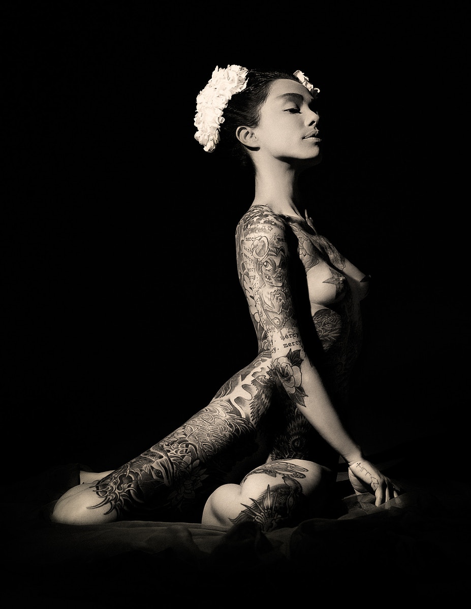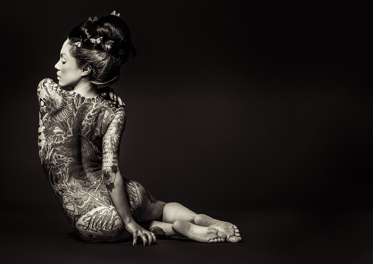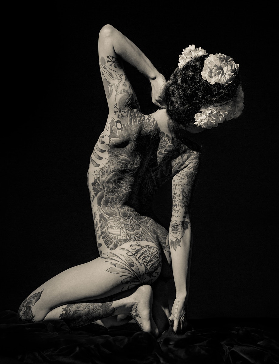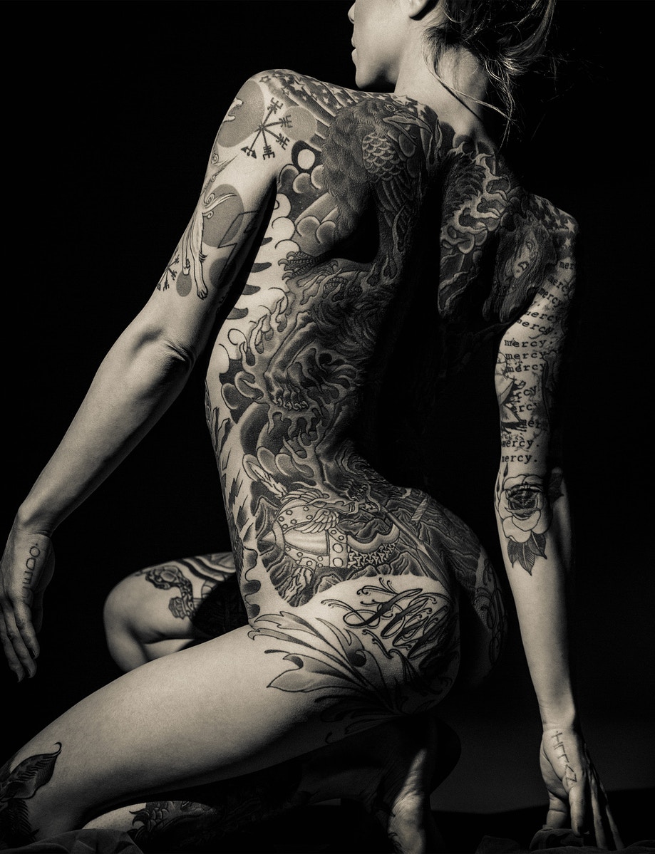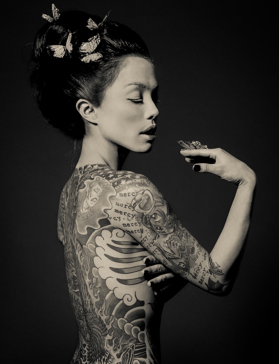 Asociados a la actividad criminal de las pandillas de Yakuski, los miembros se marcarían con los tatuajes de Irezumi. Debido a su proceso doloroso, Irezumju es considerado una marca de la valentía del receptor y evidencia de su insubordinación. A pesar de la creciente tendencia de los tatuajes entre los no-yakuza, todavía tienen un estigma importante en la sociedad japonesa. Al presentar su trabajo como fotografías exquisitamente elaboradas a gran escala, Nyari eleva su modelo al de Diosa, o tal vez, a la Virgen María, subvirtiendo los conceptos de pureza y sexualidad, religión y pecado. Se presenta a la contemplación meditativa del espectador como un símbolo de fortaleza, desafío y deseo femenino sin arrepentimiento; su cuerpo en exhibición para la adoración, los tatuajes que lo adornan, como si fueran cuentas de un rosario. Geisha Ink cuenta la embriagadora historia de Ginzilla, que revela y subvierte los arquetipos femeninos a través de una exploración visual de la sexualidad, los tabúes, el erotismo y la cultura.