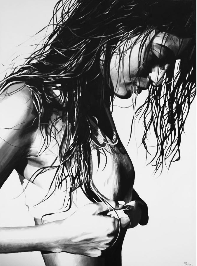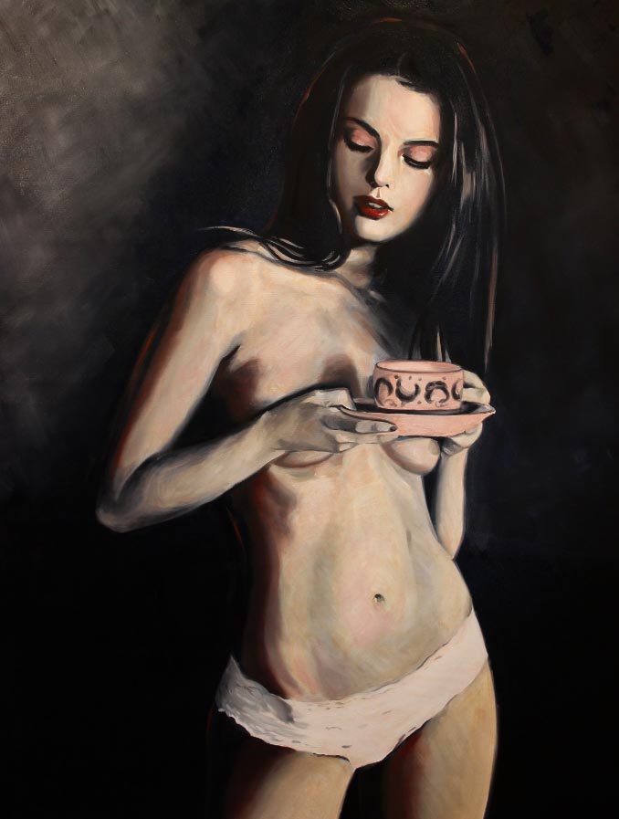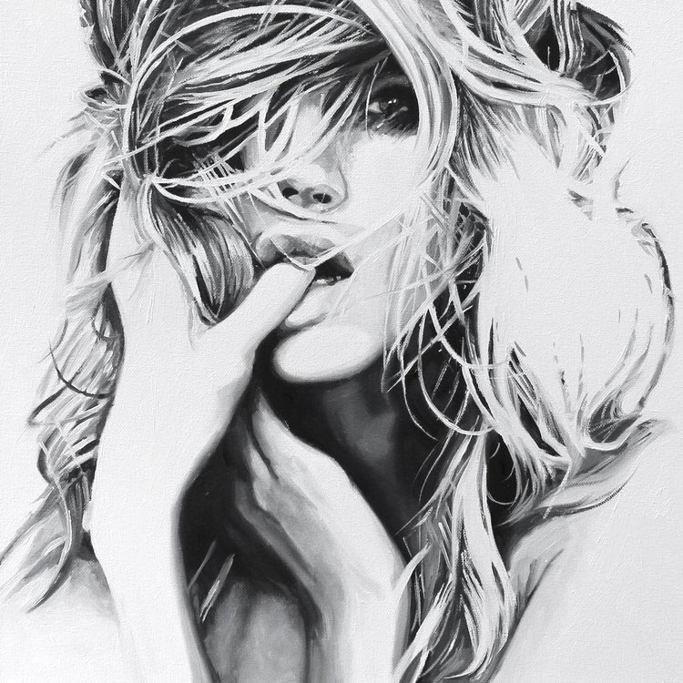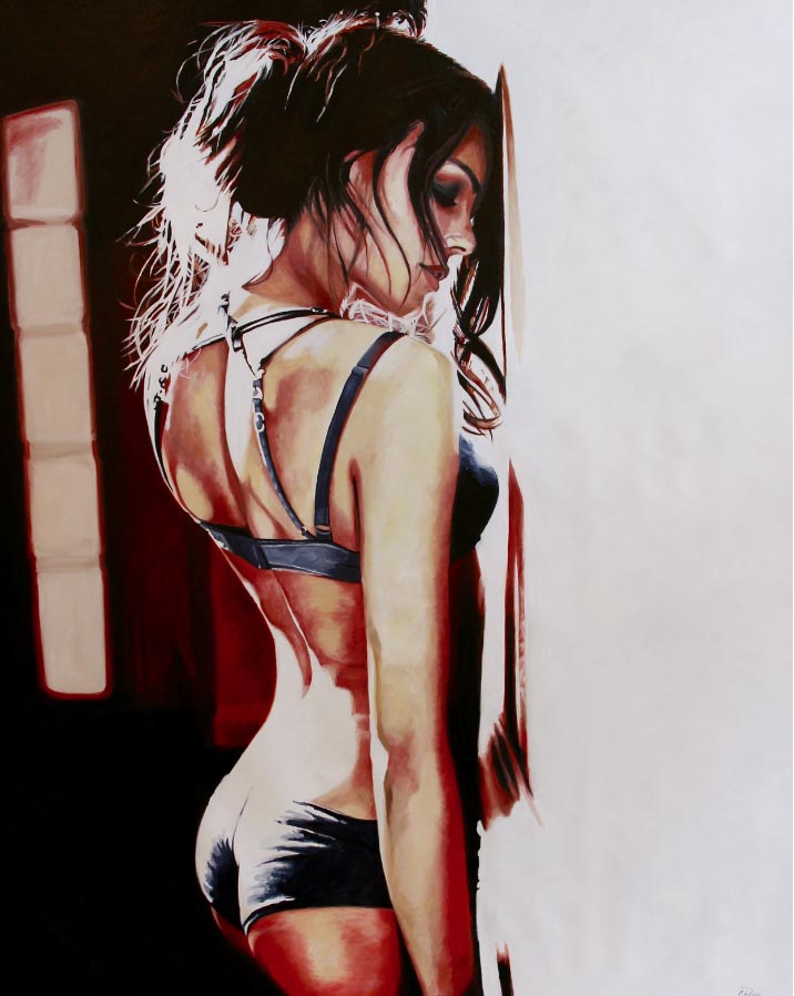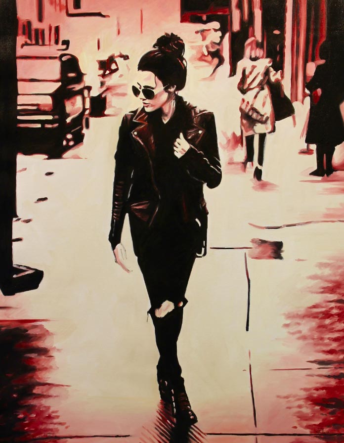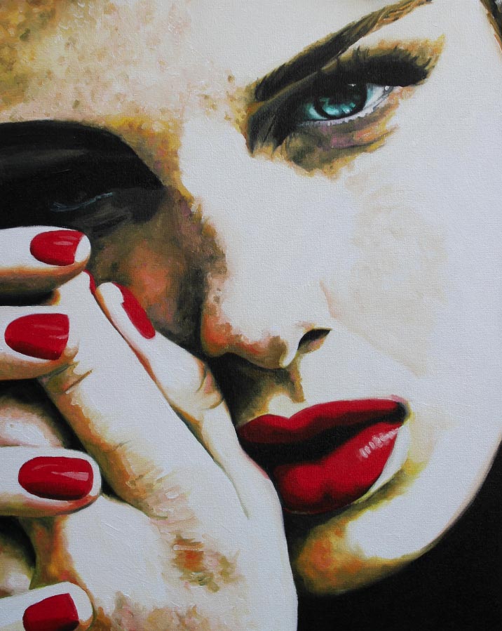 «Mi objetivo original era crear pinturas que fueran simplemente impresionantes y hermosas, volviendo a mis raíces de la ilustración de la moda. Cuando comencé mi proceso de reinvención me encontré atraída por imágenes de mujeres que son inquietas y sexys. Recogiendo recortes de revistas y editoriales como inspiración, trabajo de una manera semi-rrealista que representan retratos y figuras de mujeres. Cuando empiezo a trabajar observo un cambio peculiar en mi proceso de pensamiento. Ya no me preocupa la belleza de la imagen, sino cómo me habla, ¿Qué me dice la expresión o la pose?”