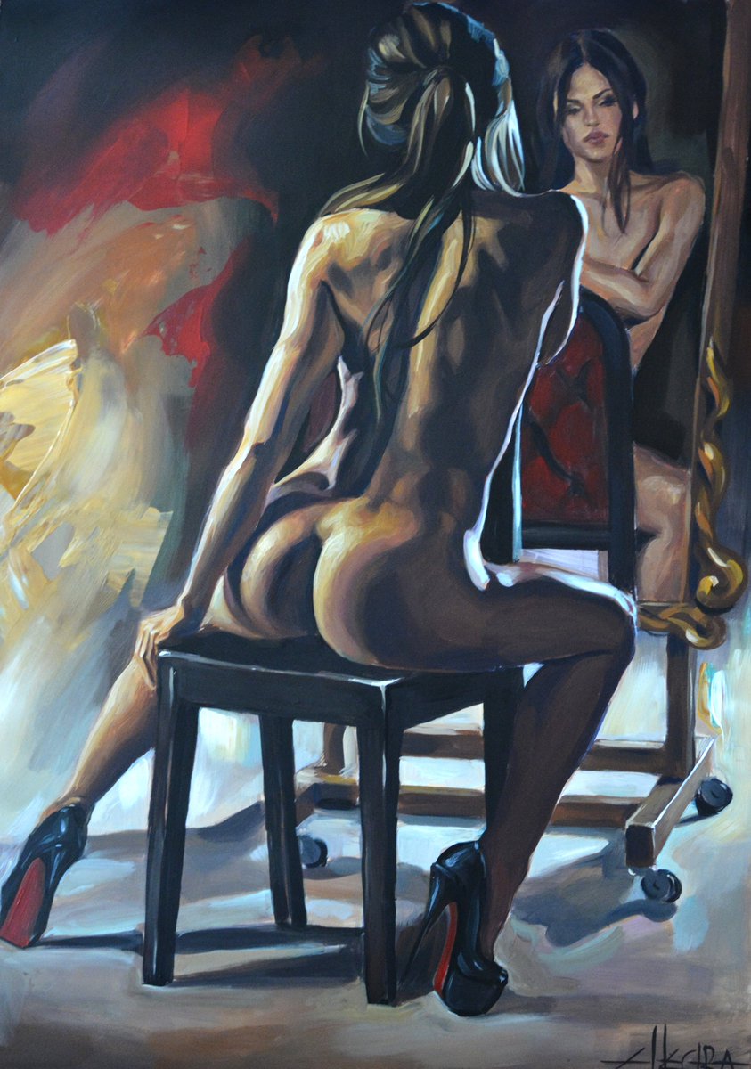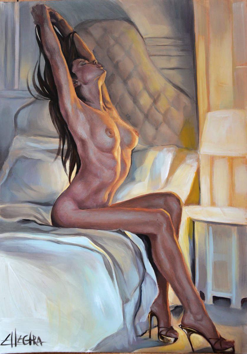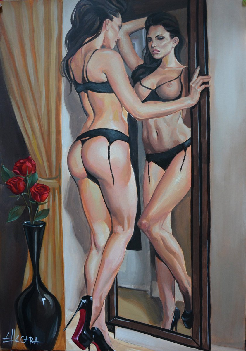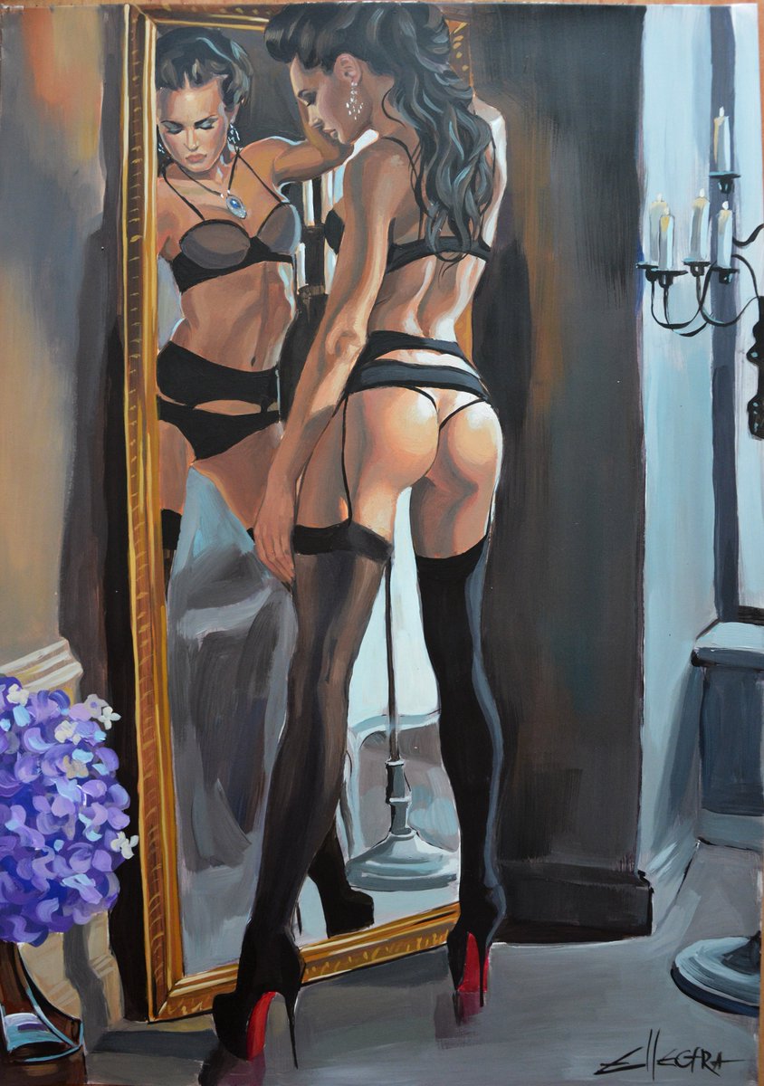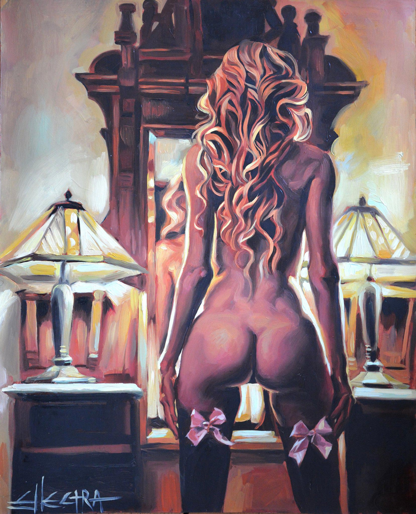 Las pinturas de Ellectra rebosan sensualidad y erotismo desde una perspectiva femenina. El magnífico empleo del color, las luces y las sombras hacen que sus trabajos rebosen vida y energía, una energía que empodera a sus modelos, que las hacen dueñas absolutas de sus momentos íntimos. Ellectra captura con elegancia esos momentos, pero no solo las mujeres son protagonistas de sus cuadros, especial atención merecen también los entornos en los que se mueven. Espejos, sillones de época o camas forman parte también de esa intimidad femenina que tan bien sabe reflejar y cuyos pliegues y colores trata con maestría.