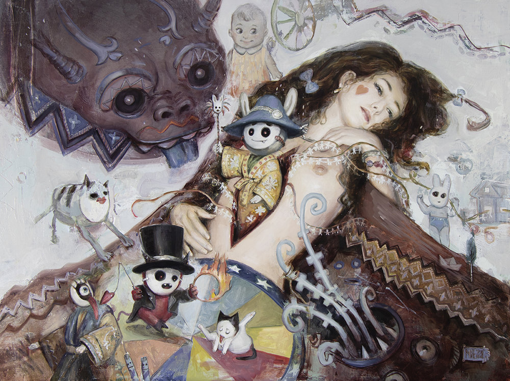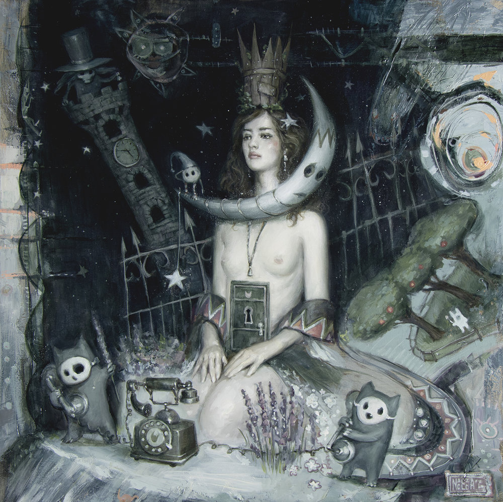 Nadezda nos transporta con sus singulares personajes a un mundo de ensueño y algo surrealista, donde un sinfín de detalles hacen de cada obra un particular espacio creativo. Influenciada por el folclore ruso y los cuentos infantiles, sus pinturas y grafitos exploran las profundidades de la imaginación. Cada una de sus obras es una historia donde se entrecruzan distintos sentimientos y sensaciones, con detalles finamente equilibrados que crean una sensación de curiosidad inquietante y magnética en el espectador.