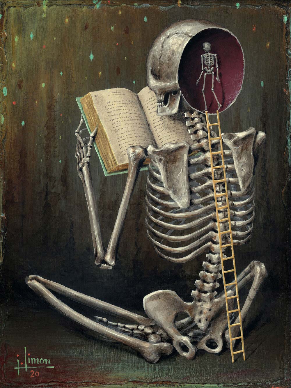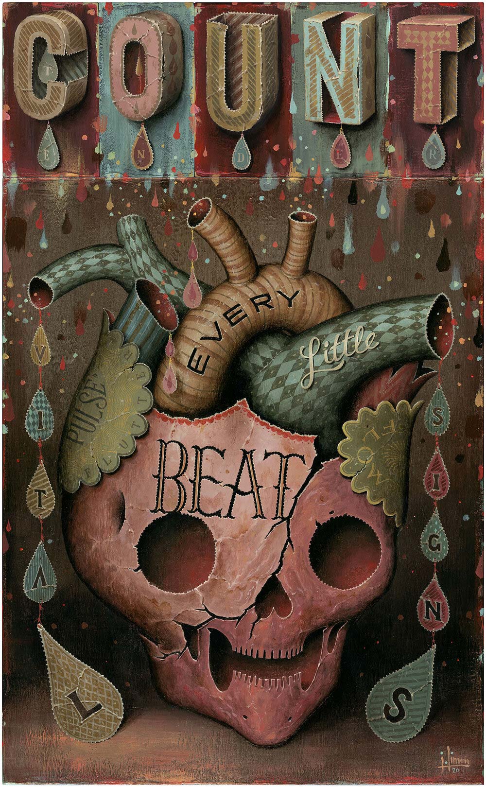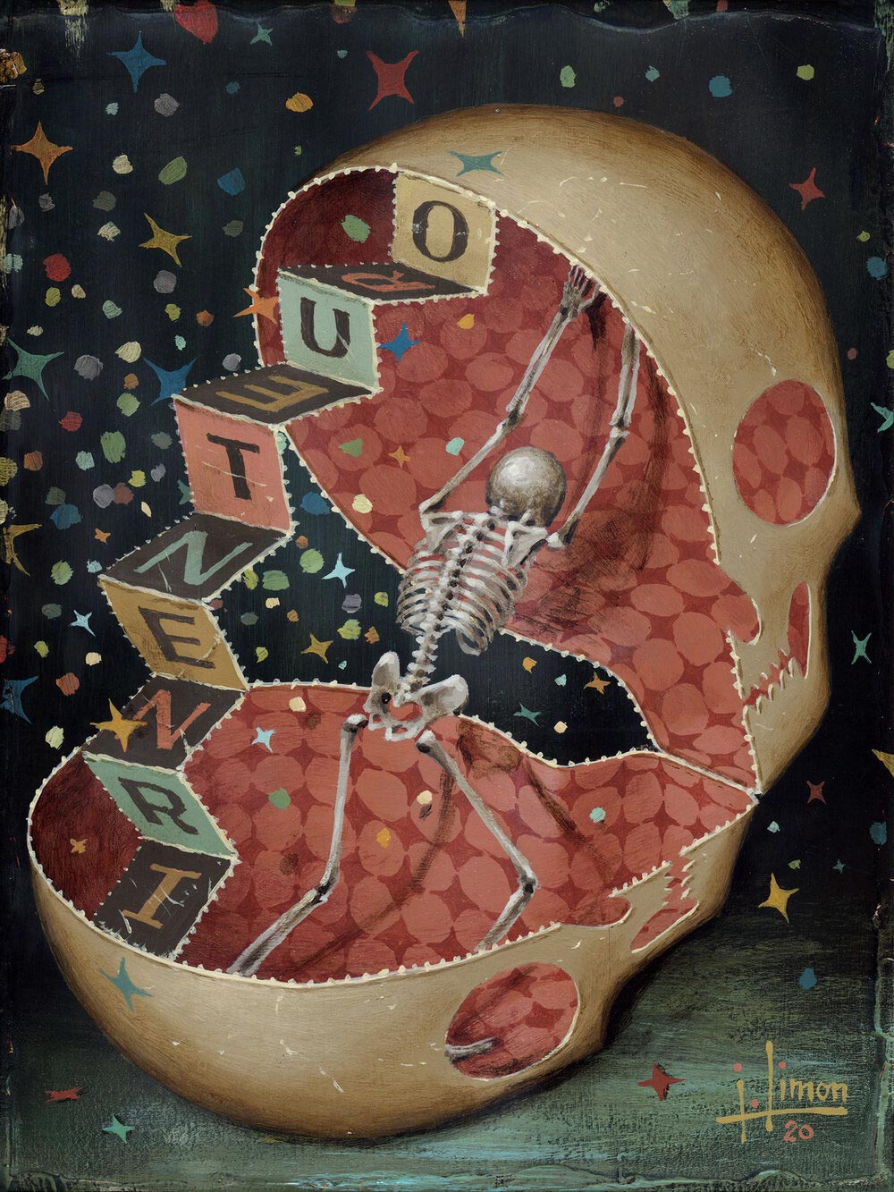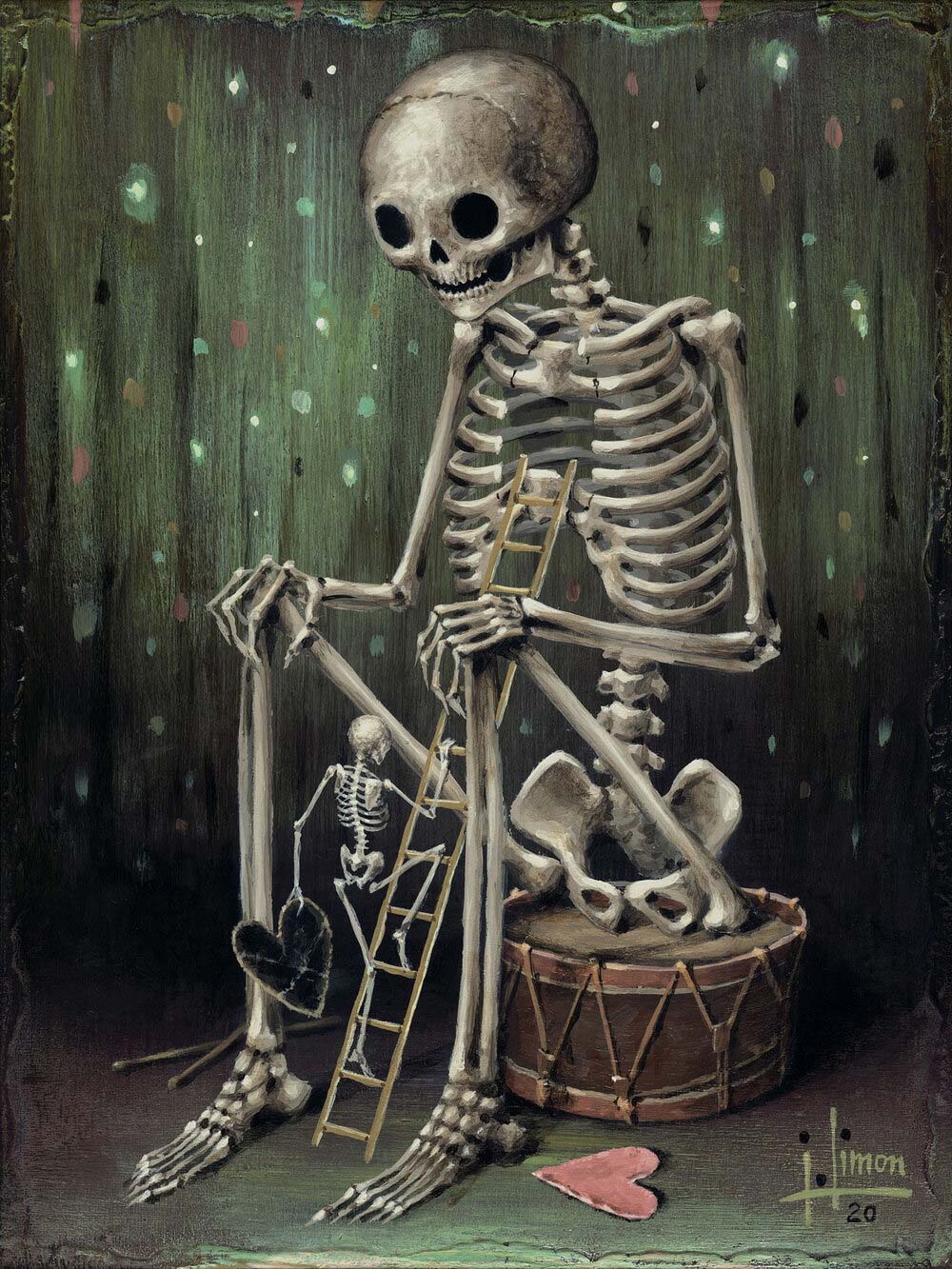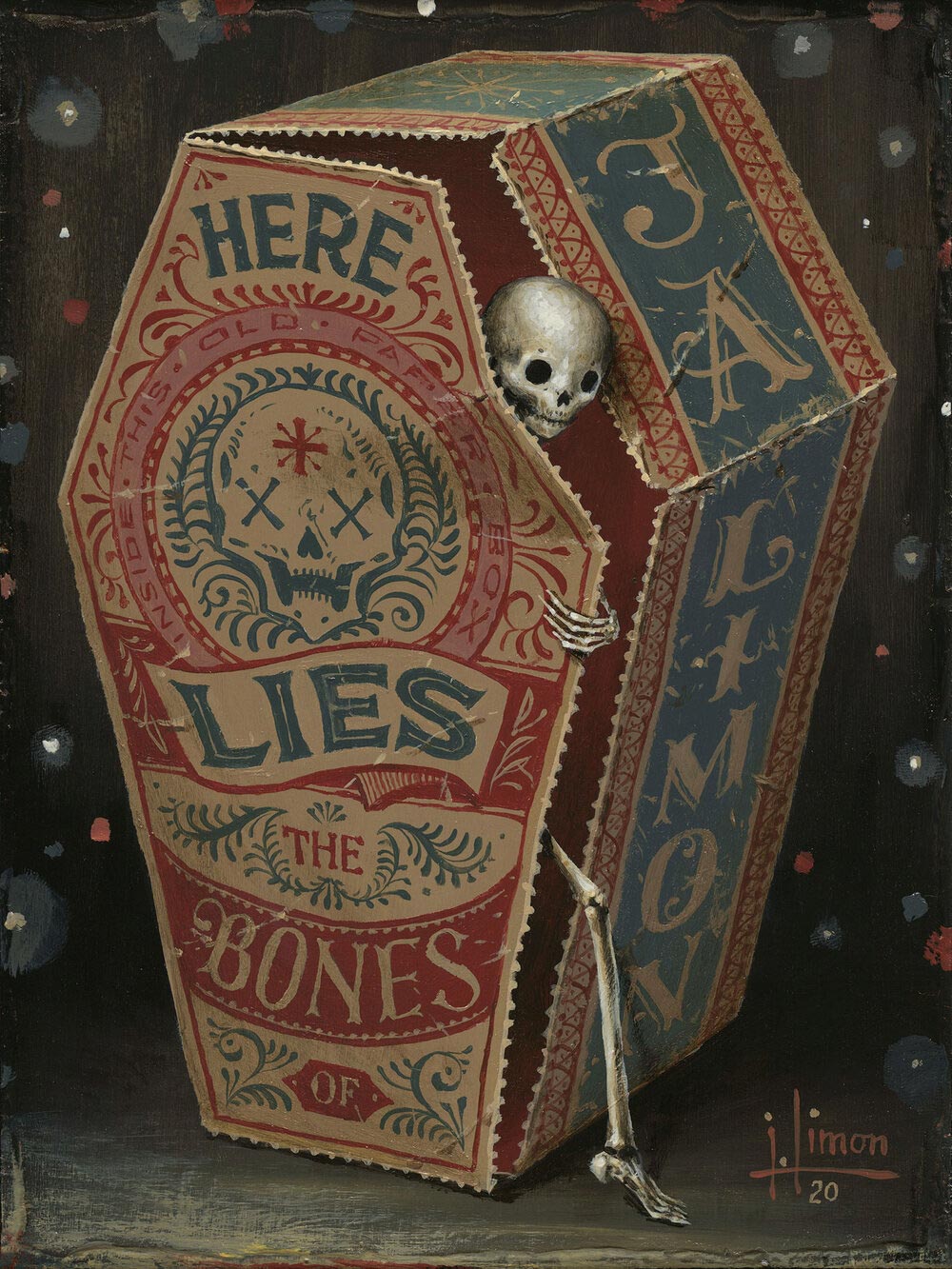Jason comenzó a crear una colección sustancial de pequeñas pinturas en acrílico en 2008. Hoy continúa agregando piezas a su serie “Fragments”, que se centra en figuras esqueléticas y formas anatómicas basadas en criaturas mitológicas y críptidos paranormales retratados con un toque de humor y con grandes dosis de extrañeza. A pesar del siniestro protagonismo de sus pinturas, Jason nos sumerge en toda una amalgama de sensaciones y sentimientos que exploran a fondo la condición humana.