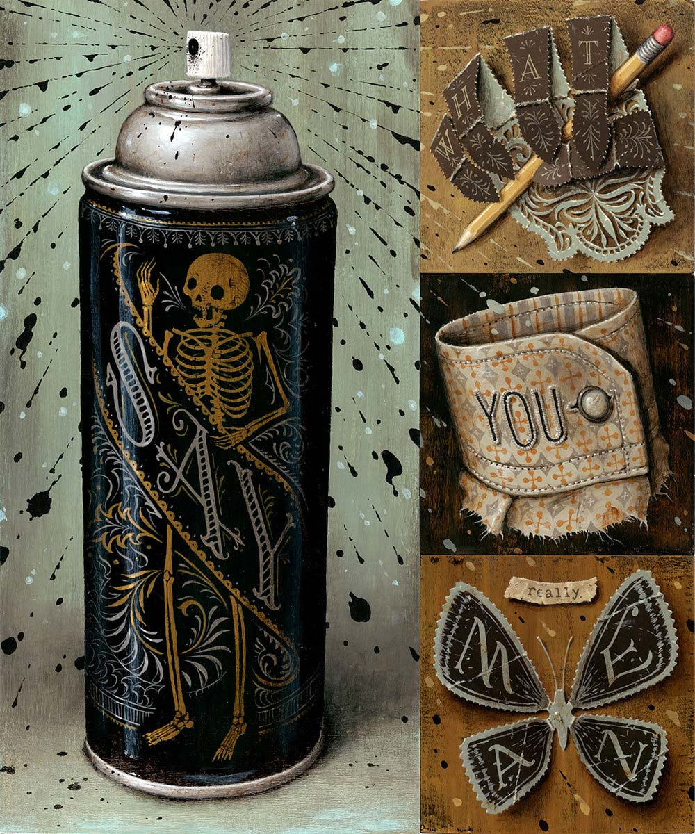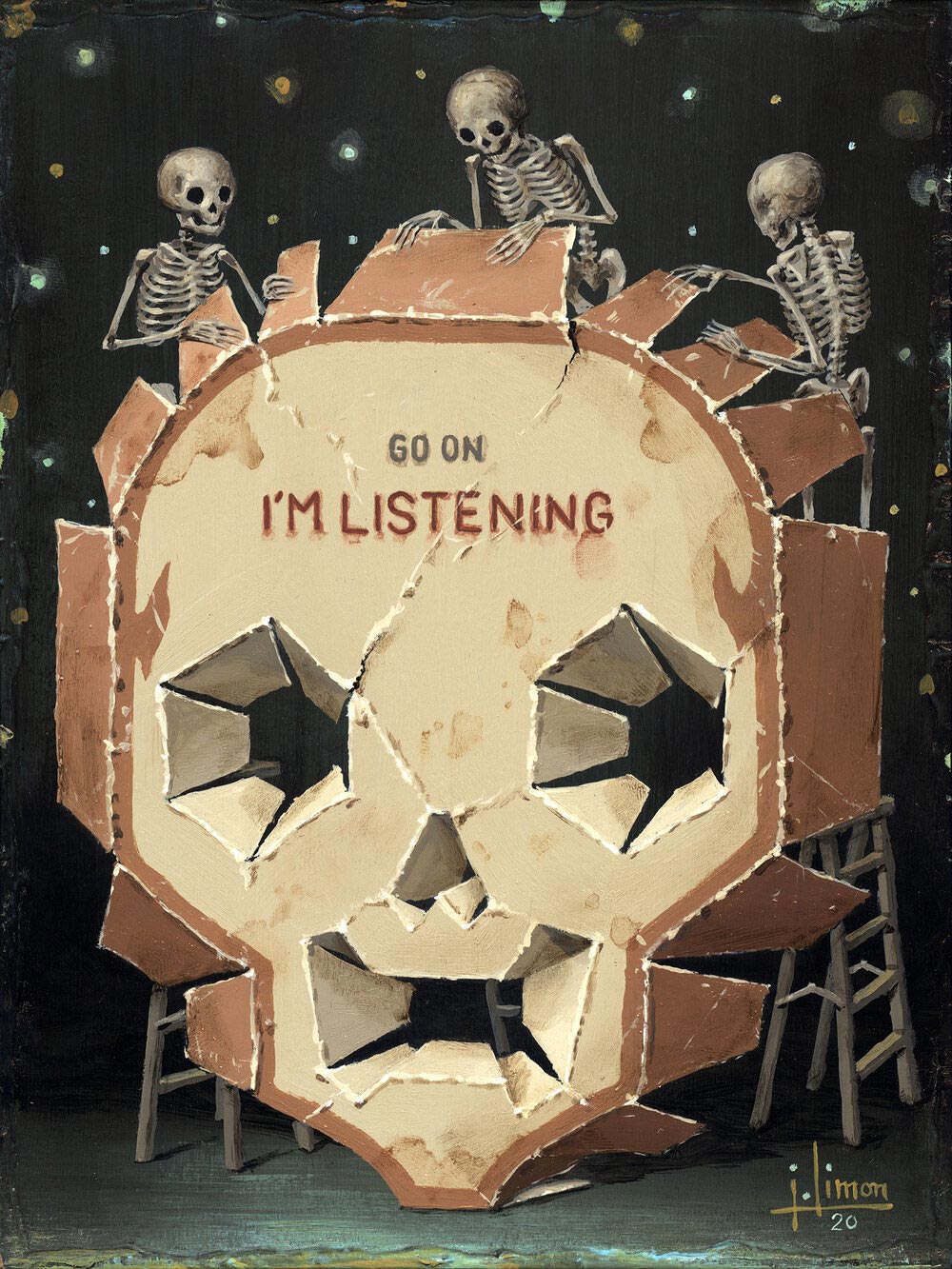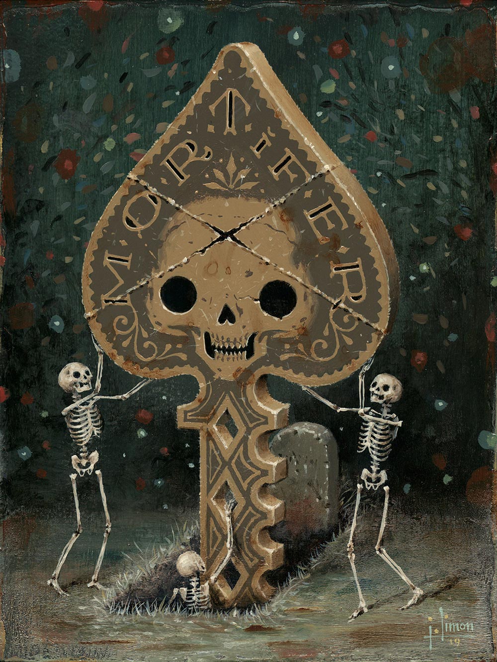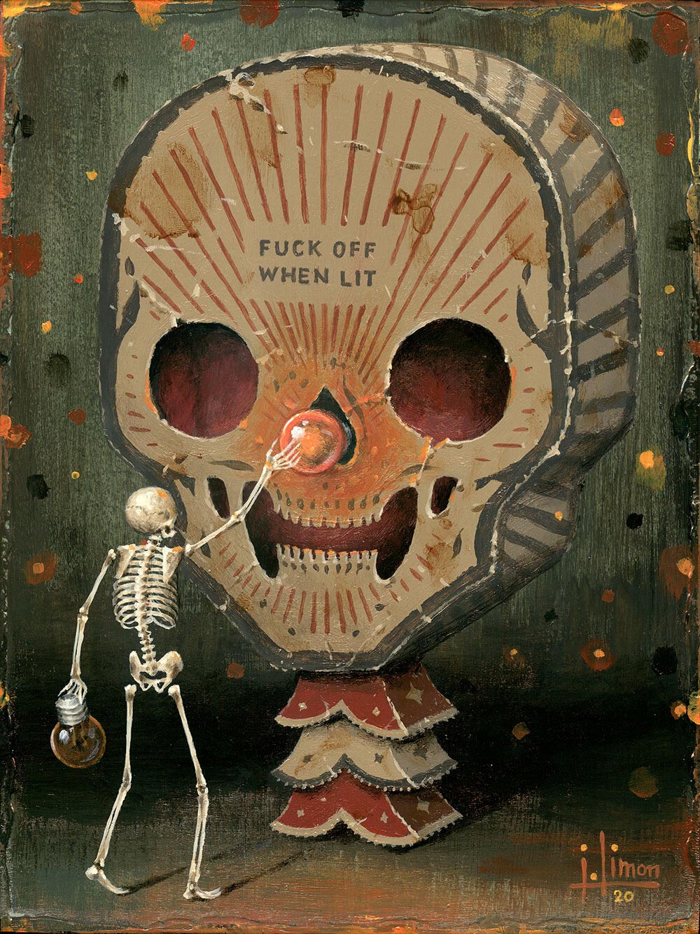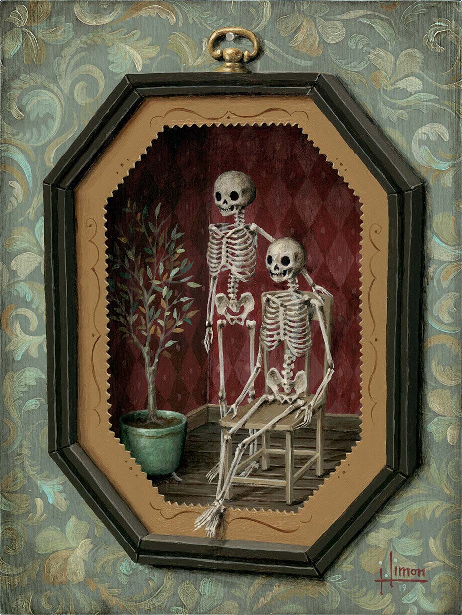 Jason comenzó a crear una colección sustancial de pequeñas pinturas en acrílico en 2008. Hoy continúa agregando piezas a su serie “Fragments”, que se centra en figuras esqueléticas y formas anatómicas basadas en criaturas mitológicas y críptidos paranormales retratados con un toque de humor y con grandes dosis de extrañeza. A pesar del siniestro protagonismo de sus pinturas, Jason nos sumerge en toda una amalgama de sensaciones y sentimientos que exploran a fondo la condición humana.