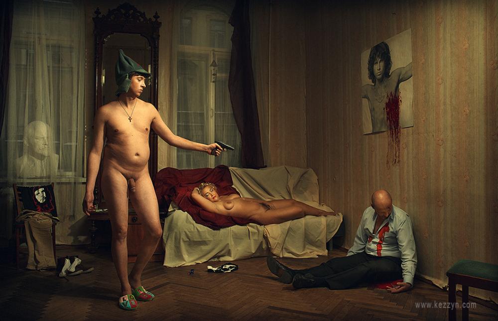 La iconografía surrealista y extraña son la base del trabajo fotográfico de Andrey Kezzyn. Sus series representan la cultura popular, el arte o los fenómenos históricos donde varias capas de significados nos llevan a un reflejo de valores políticos, religiosos y morales de la sociedad contemporánea. Todas sus obras surgen como resultado de la colaboración de su equipo, a quien siempre agradece su activa participación. Aunque con un claro impulso humorístico, sus fotos terminan siendo de alguna forma una gran sátira social.